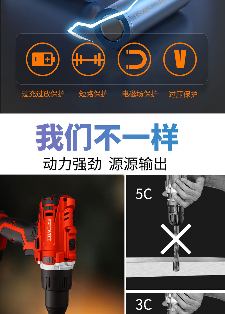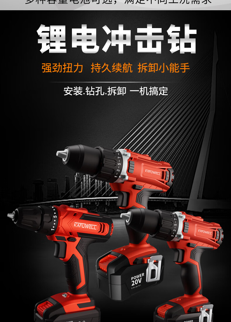 卡夫威尔20V双速锂电钻 强力充电动螺丝刀 电起子2.0Ah电池PA4219F-Y-2S-1