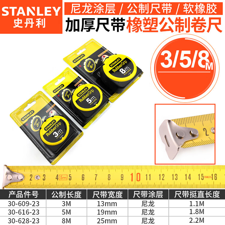 史丹利(STANLEY)橡塑公制卷尺5m钢卷尺测量尺木工尺伸缩尺带锁定功能30-616-23