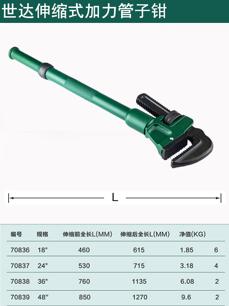 > 世达(SATA) 五金水暖维修工具水管安装管子钳子18英寸水管钳扳手 70836 现货