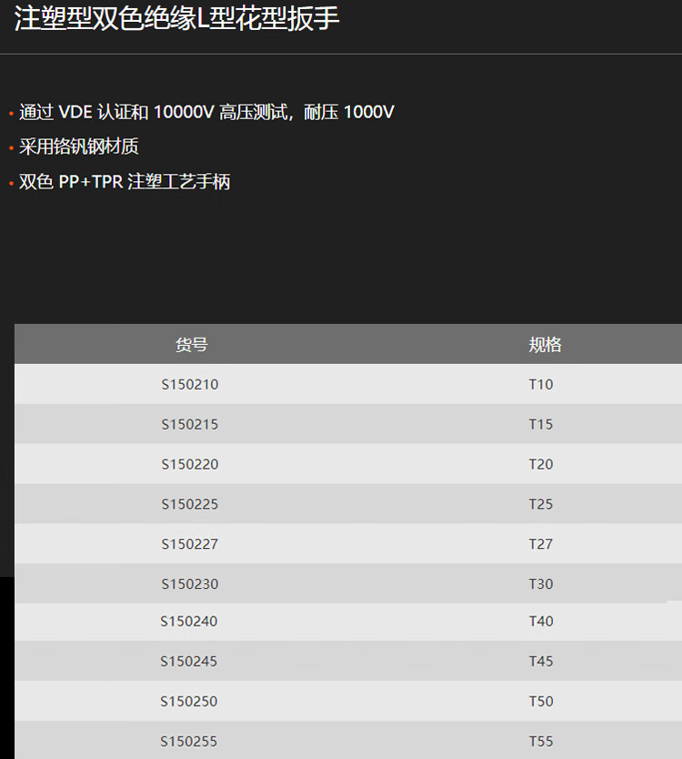 > 钢盾SHEFFIELD S150225 注塑型双色绝缘L型花型扳手T25