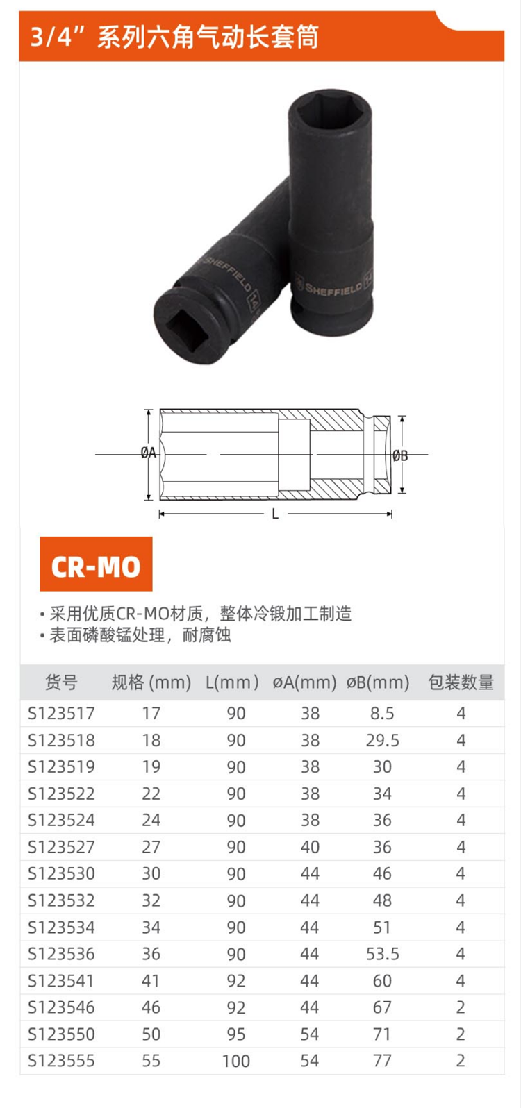 > 钢盾 SHEFFIELD S123519 3/4英寸系列六角风动长套筒19MM
