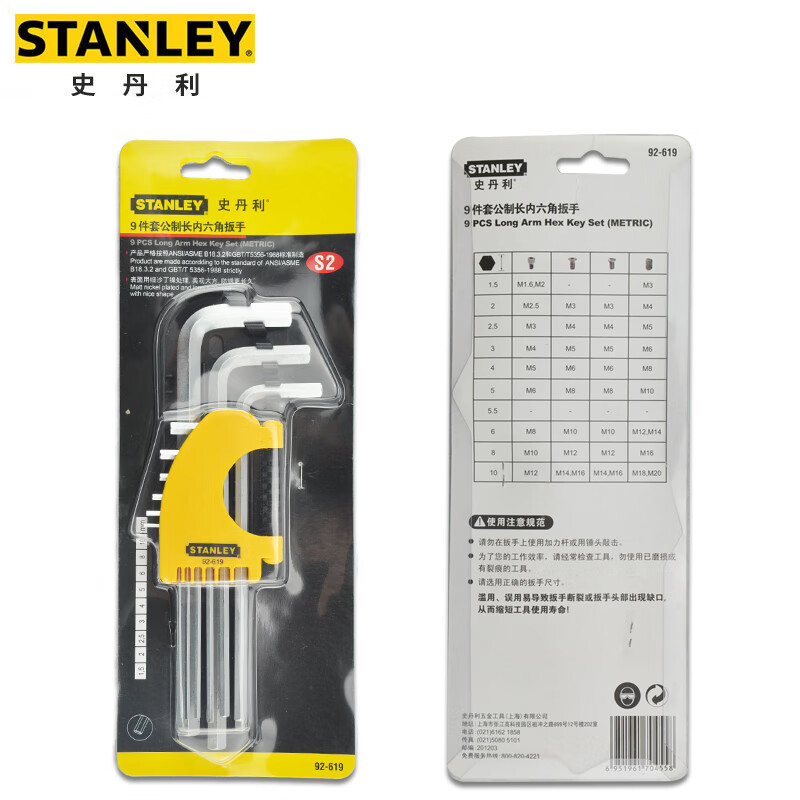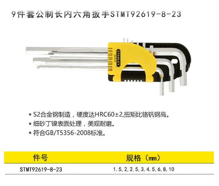 > 史丹利(STANLEY)9件套公制长内六角扳手1.5-10mm六棱螺丝刀L型扳手组套STMT92619