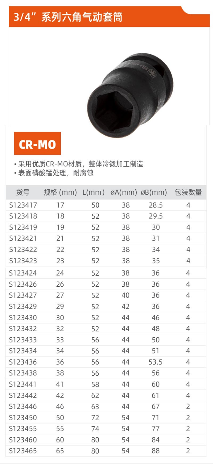 钢盾 SHEFFIELD S123423 3/4英寸系列六角风动套筒23MM
