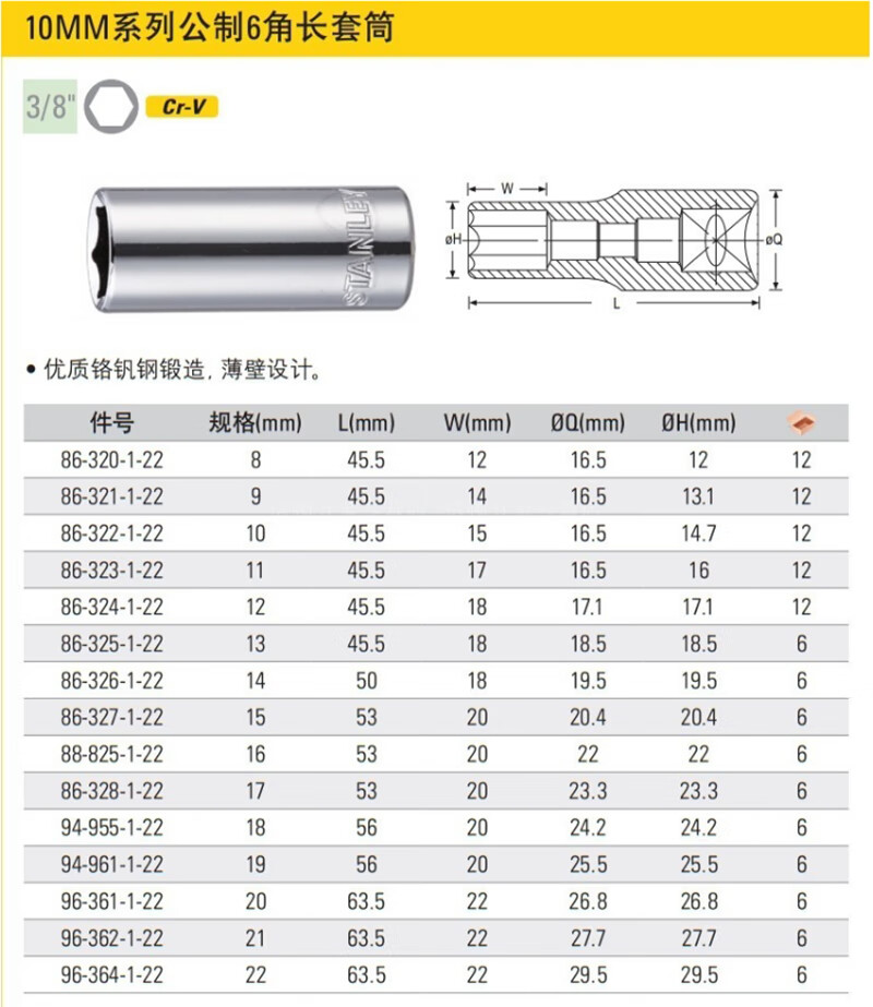 > 史丹利(STANLEY)10MM系列公制6角长套筒21mm修机修棘轮扳手中飞套筒96-362