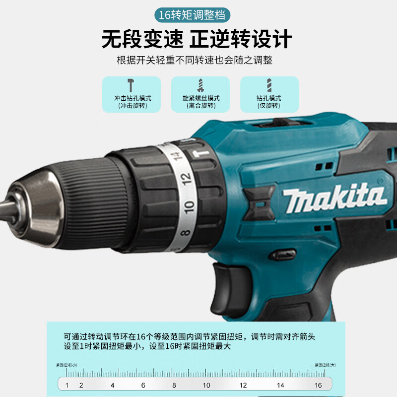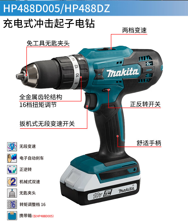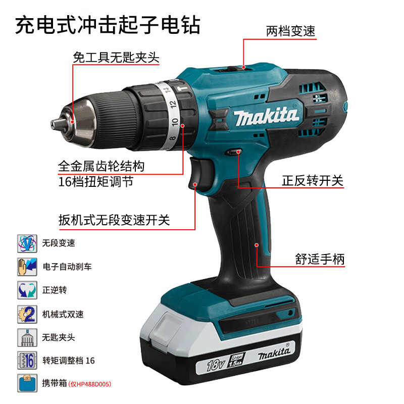 > 牧田(MAKITA)HP488D005 手电钻充电起子电钻锂电池冲击钻电动螺丝刀18V 1电1充