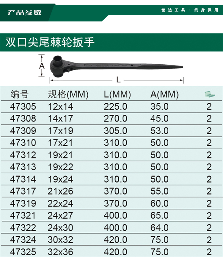 > 世达(SATA) 公制双口尖尾棘轮扳手30x32mm 板子 梅花扳手 47324 现货