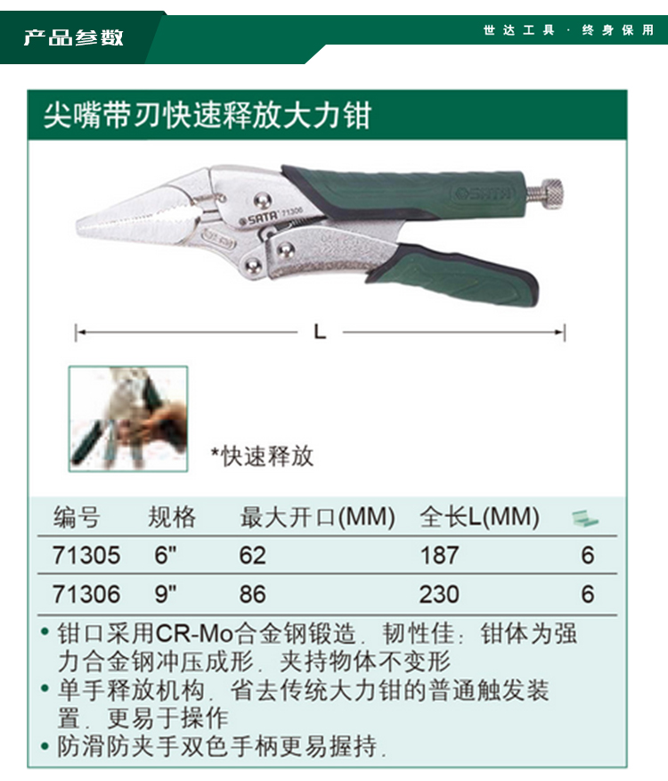 > 世达(SATA) 9寸尖嘴带刃快速释放大力钳 省力钳快速释放大力钳链条型C型大力钳焊接用 71306 现货