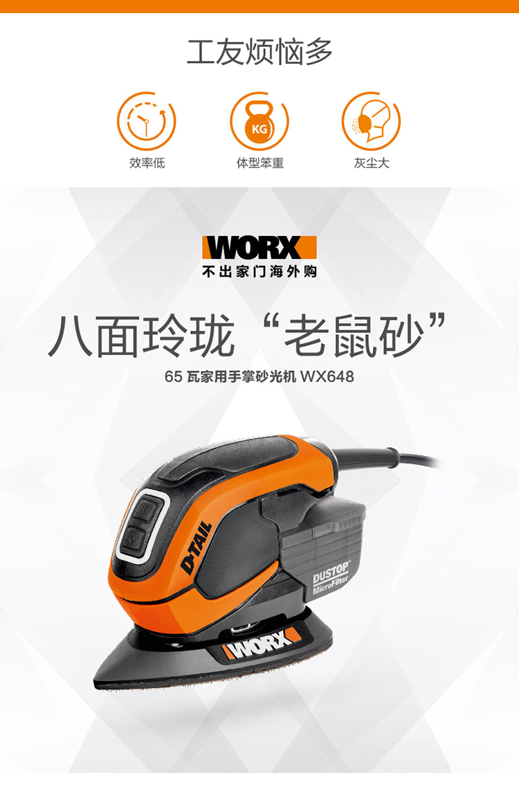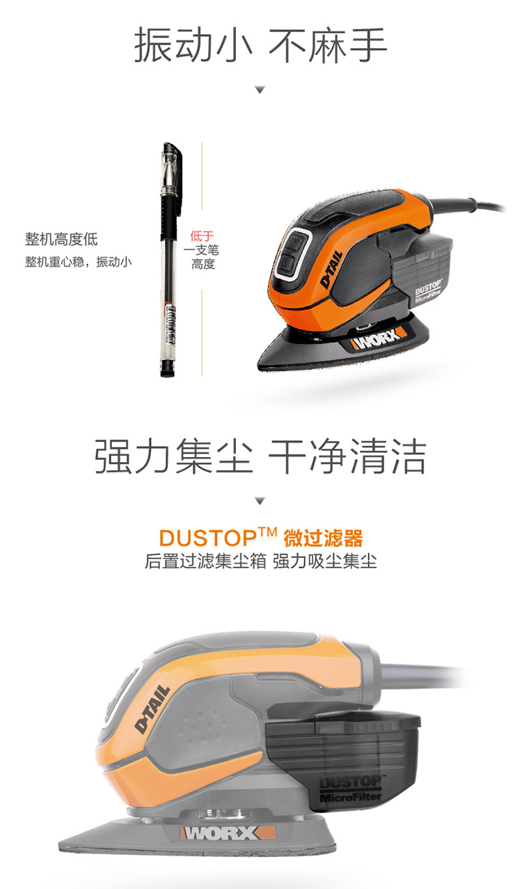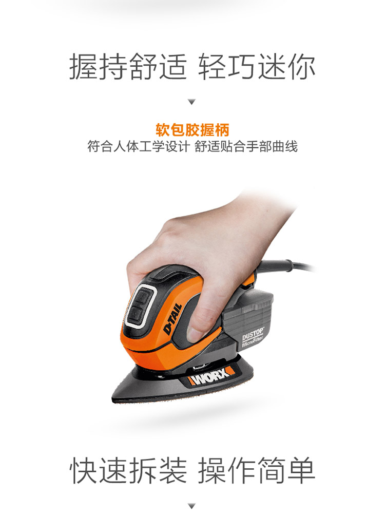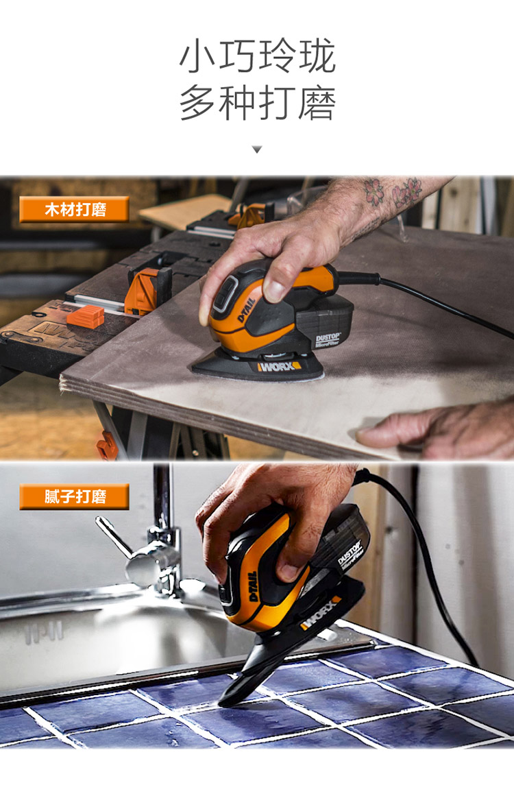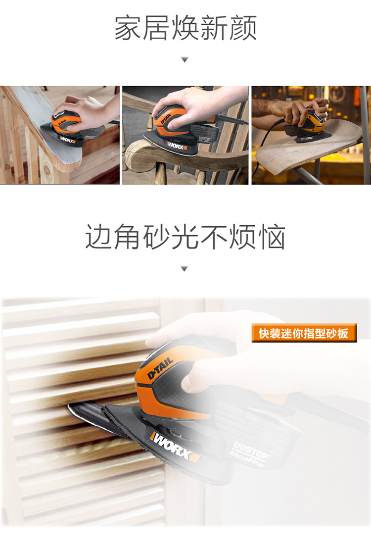 > 威克士(WORX)木工砂纸机WX648.1木板砂光机平板砂皮机木材磨砂机油漆抛光机家具打磨机五金电动工具