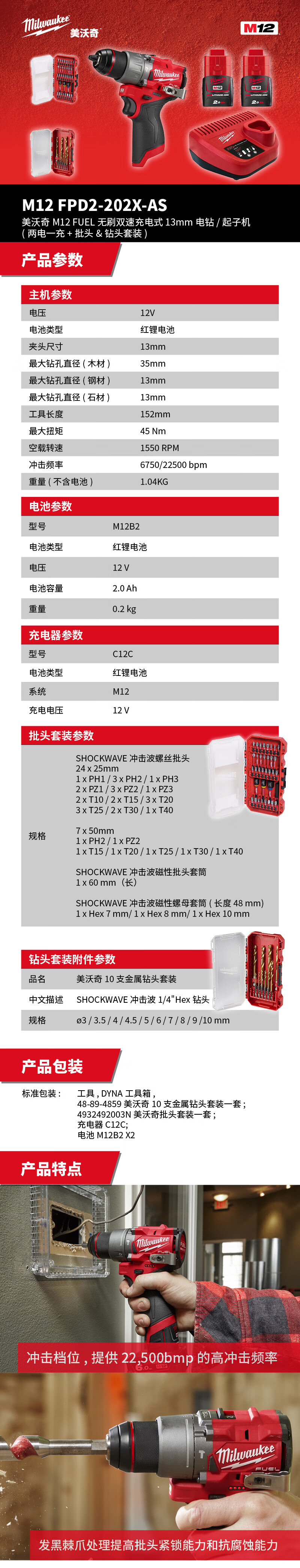 > 美沃奇 M12 FPD2-202X-AS M12 FUEL无刷双速充电式13mm电钻/起子机(两电一充+批头&钻头套装)