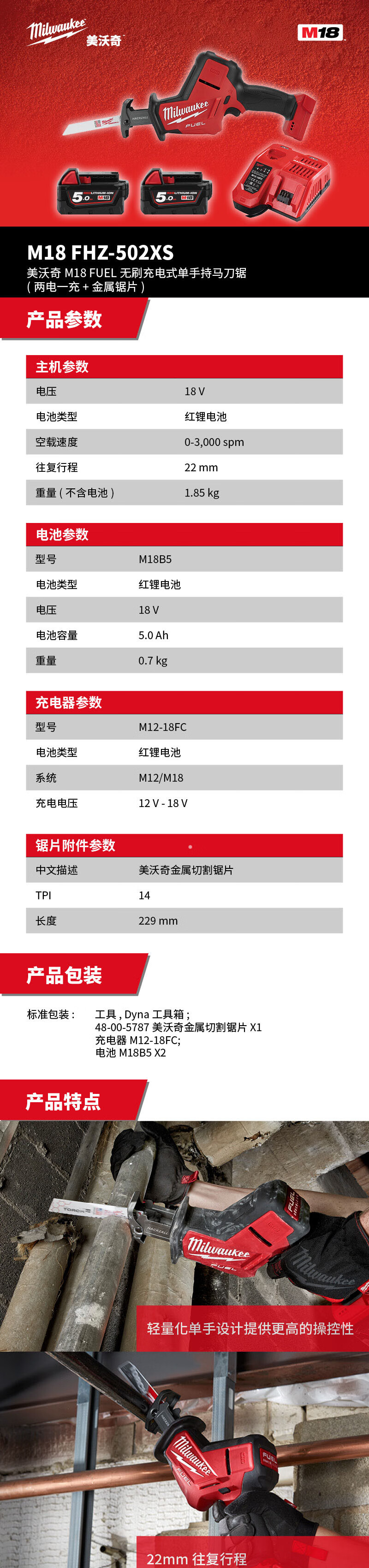 > 美沃奇 M18 FHZ-502XS M18 FUEL无刷充电式单手持马刀锯(两电一充+金属锯片) 其他 30天