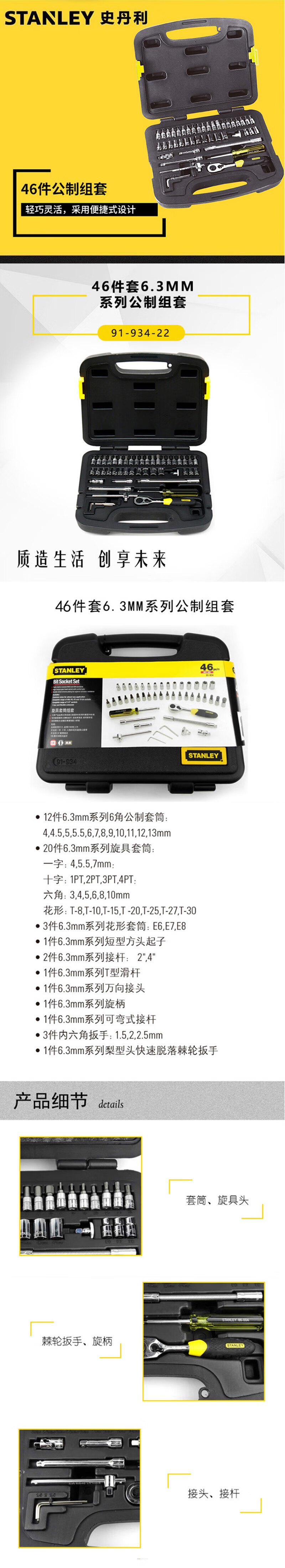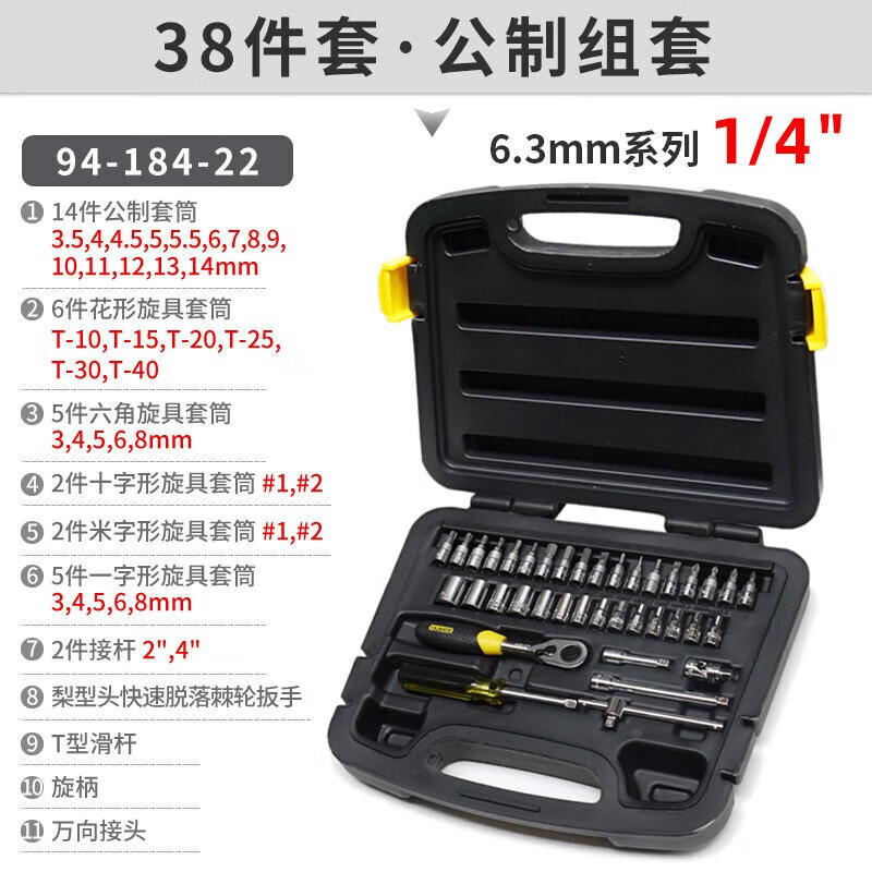 史丹利(STANLEY)38件套6.3MM系列公制组套机修汽修扳手套筒工具箱组合94-184