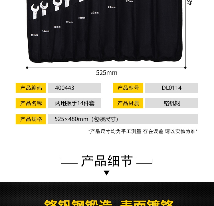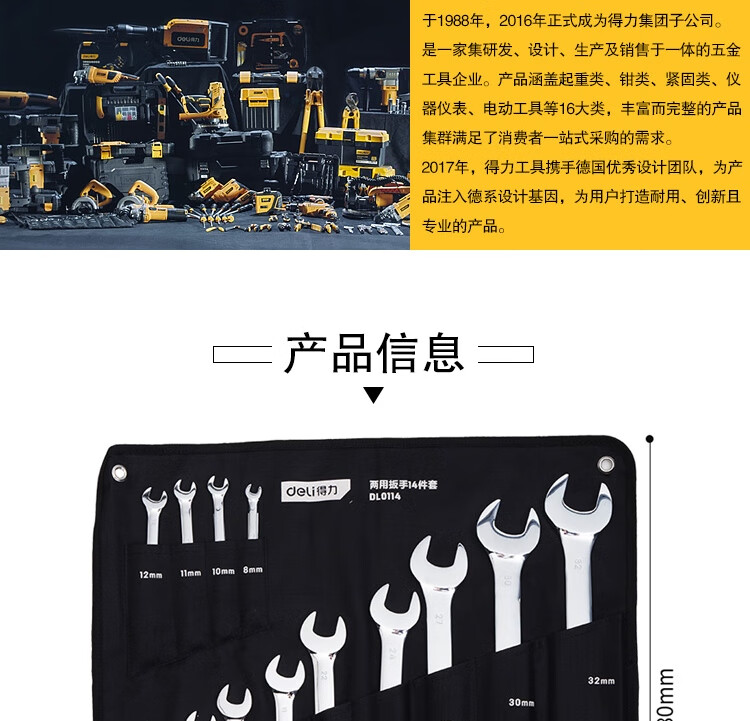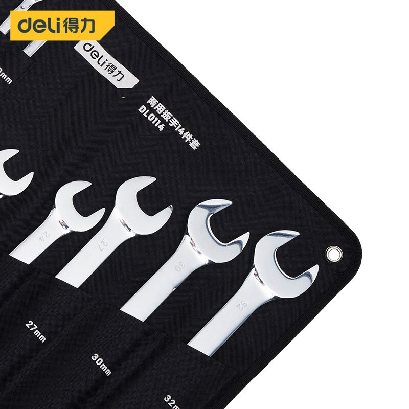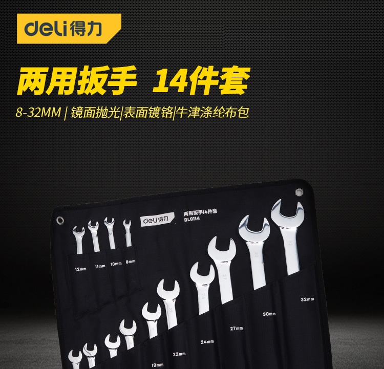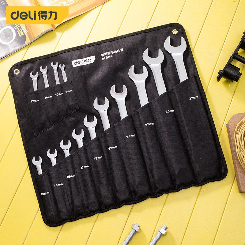 > 得力(deli) 两用扳手套装 镜面开口梅花扳手 五金工具省力扳手14件套手8-32mm DL0114 400443