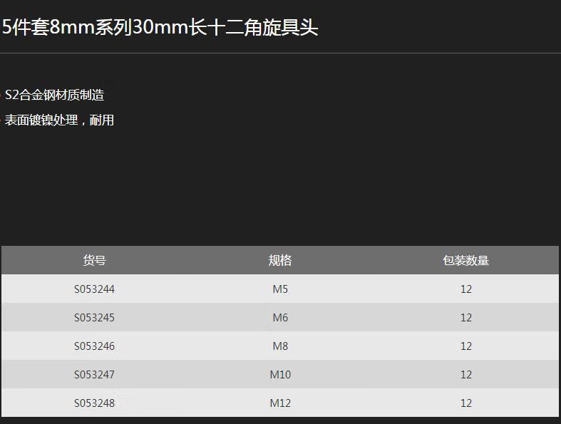 > 钢盾 SHEFFIELD S053245 5件套8mm系列30长十二角旋具头M6