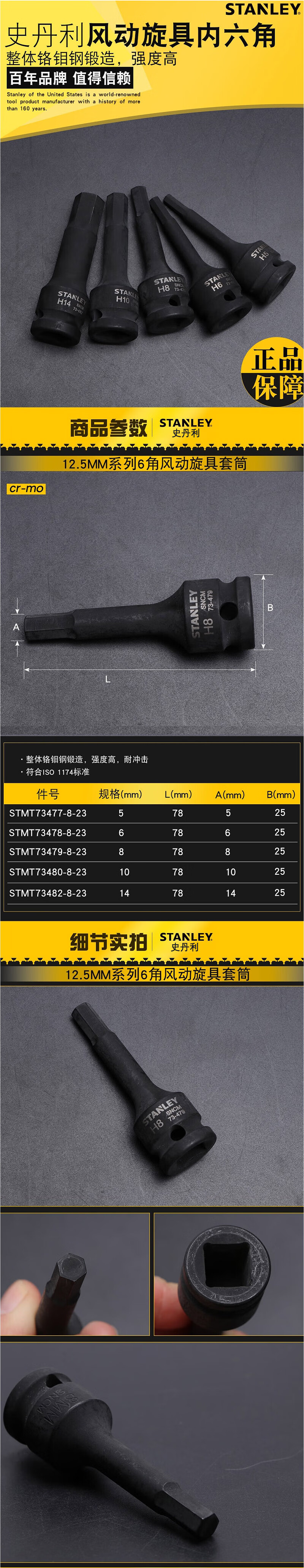 > 史丹利(STANLEY)12.5MM系列内六角风动旋具套筒H8小风炮气动扳手批头STMT73479