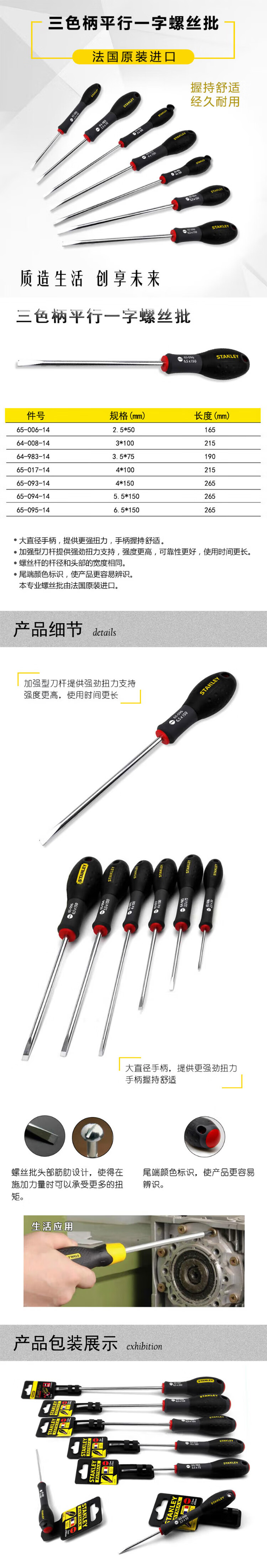 > 史丹利(STANLEY)三色柄平行一字螺丝批2.5x50mm家用多功能维修螺丝刀65-006-14
