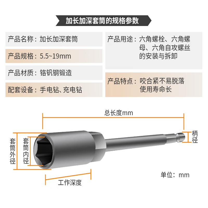 安达通 加长加深套筒 5.5-19MM风批套筒头加深6六角电动螺丝刀批头套筒 6-19mm(14pc袋装)