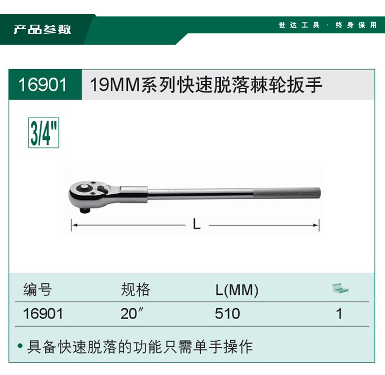 > 世达(SATA) 19MM系列快速脱落棘轮扳手3/4英寸飞扳 16901 现货