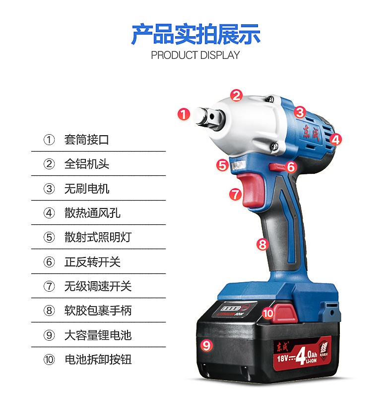 > 东成 锂电电动扳手 充电冲击板手大扭力18V无刷正反转可调速 套筒架子工脚手架DCPB280东城 DCPB280B型(4.0Ah无刷两电一充)