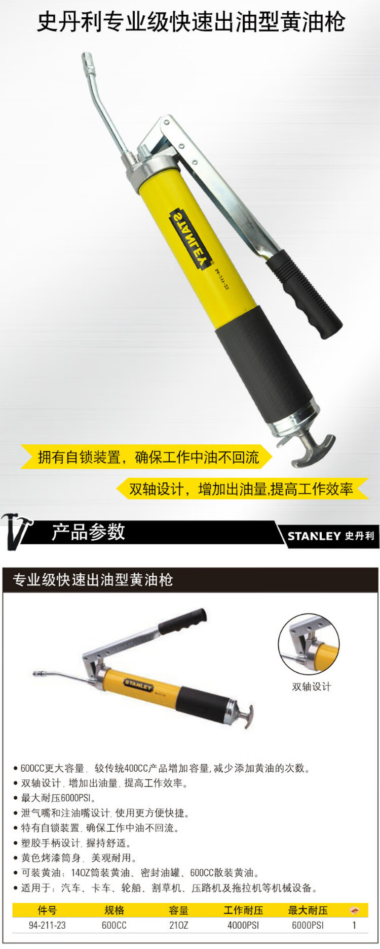 史丹利(STANLEY)专业级快速出油型黄油枪600CC高压黄油加注机打油枪94-211-23
