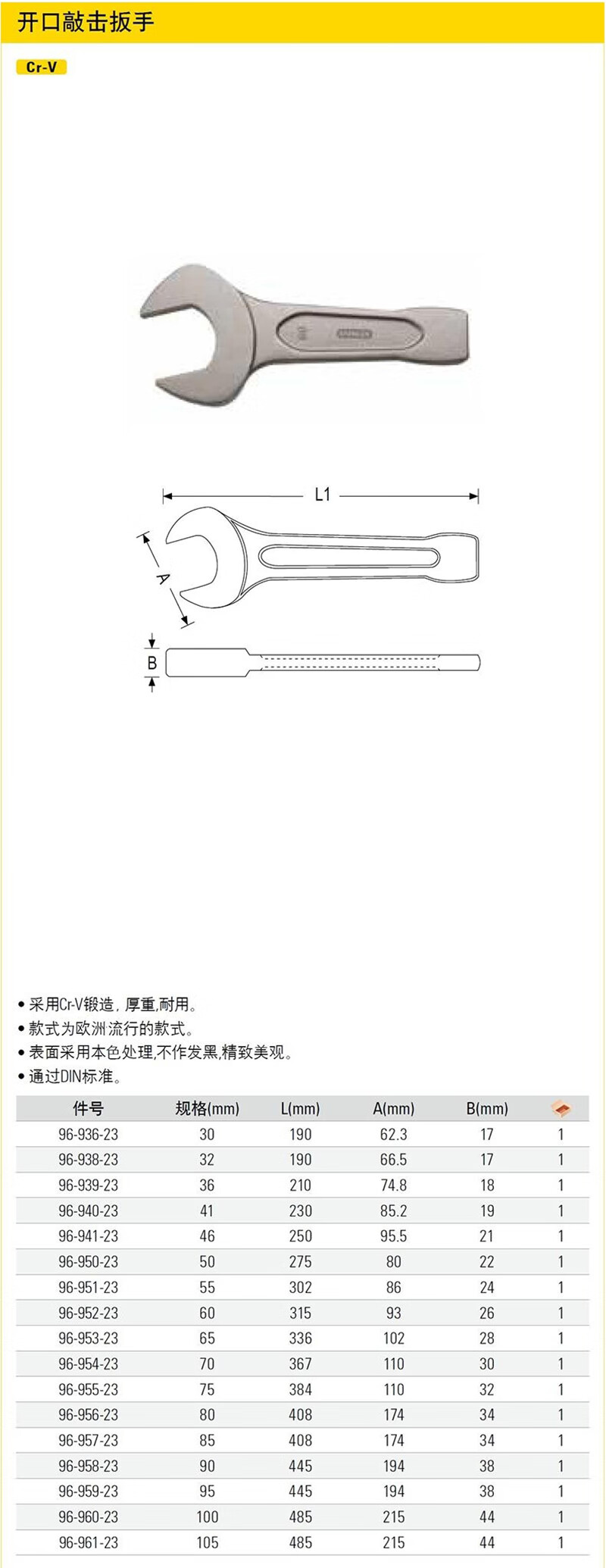> 史丹利(STANLEY)公制重型单头开口敲击扳手75mm直柄敲击呆扳手96-955