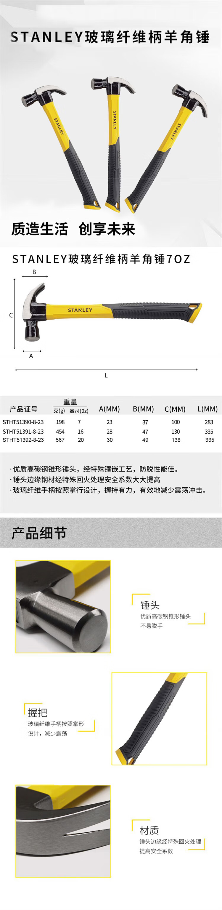 > 史丹利(STANLEY)玻璃纤维柄羊角锤16oz起钉器装修铁榔头安装锤STHT51391-8-23