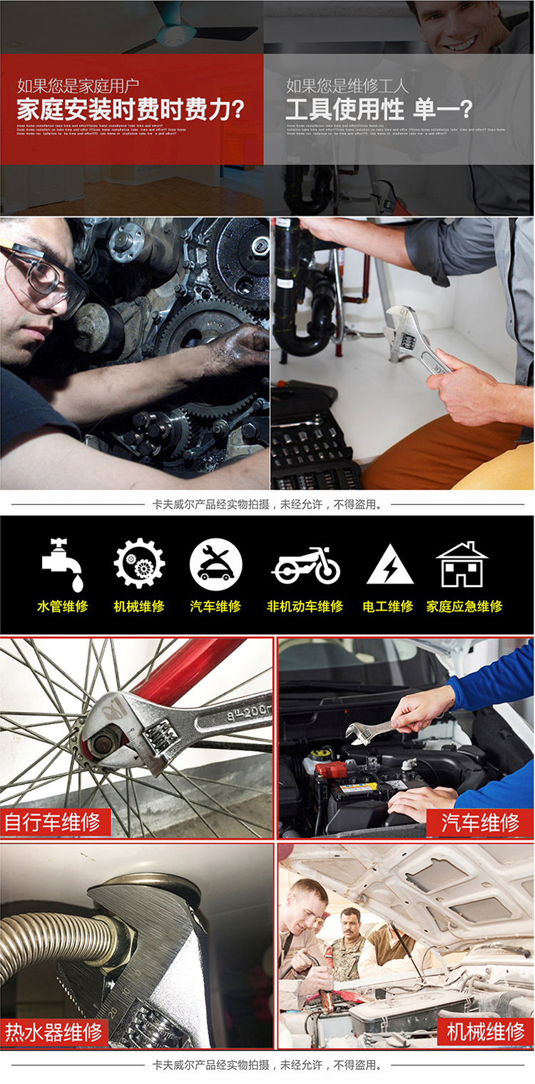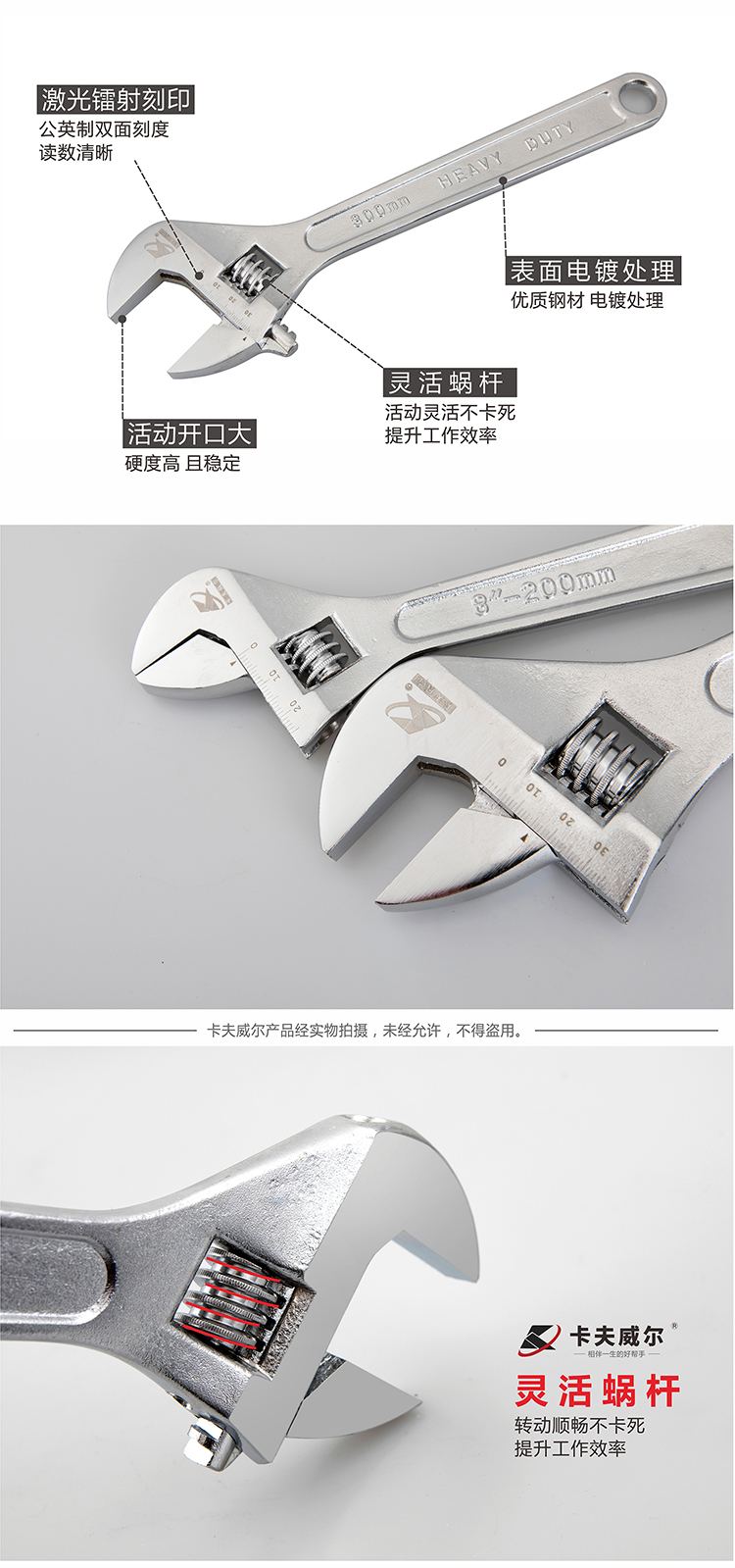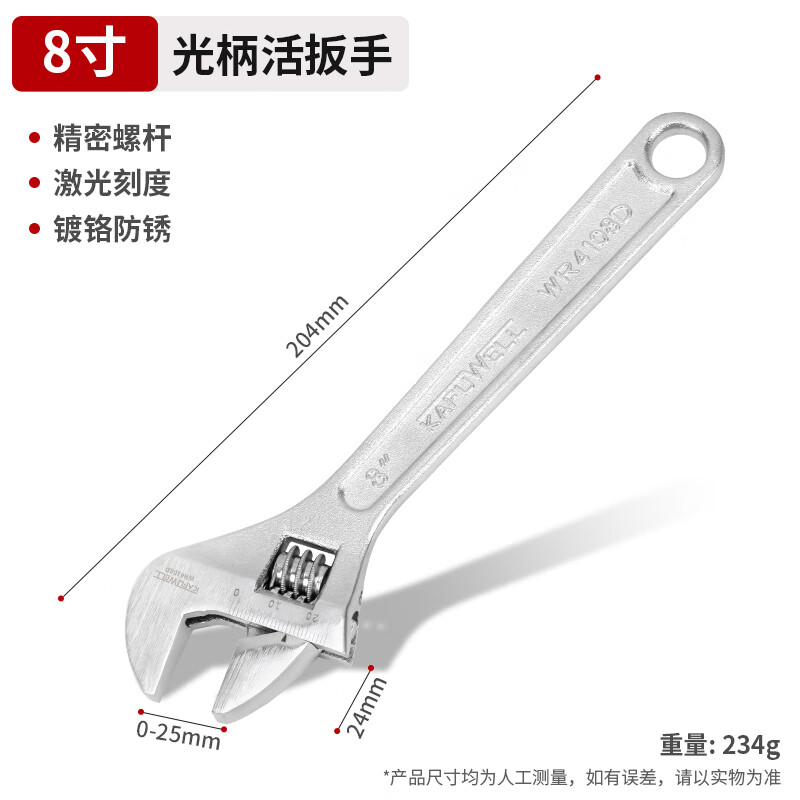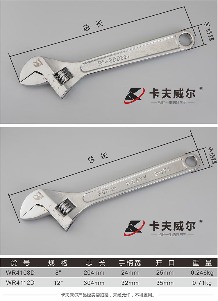 > 卡夫威尔 8寸活动扳手活口卫浴活络扳子 大开口管钳扳手200mm WR4108D