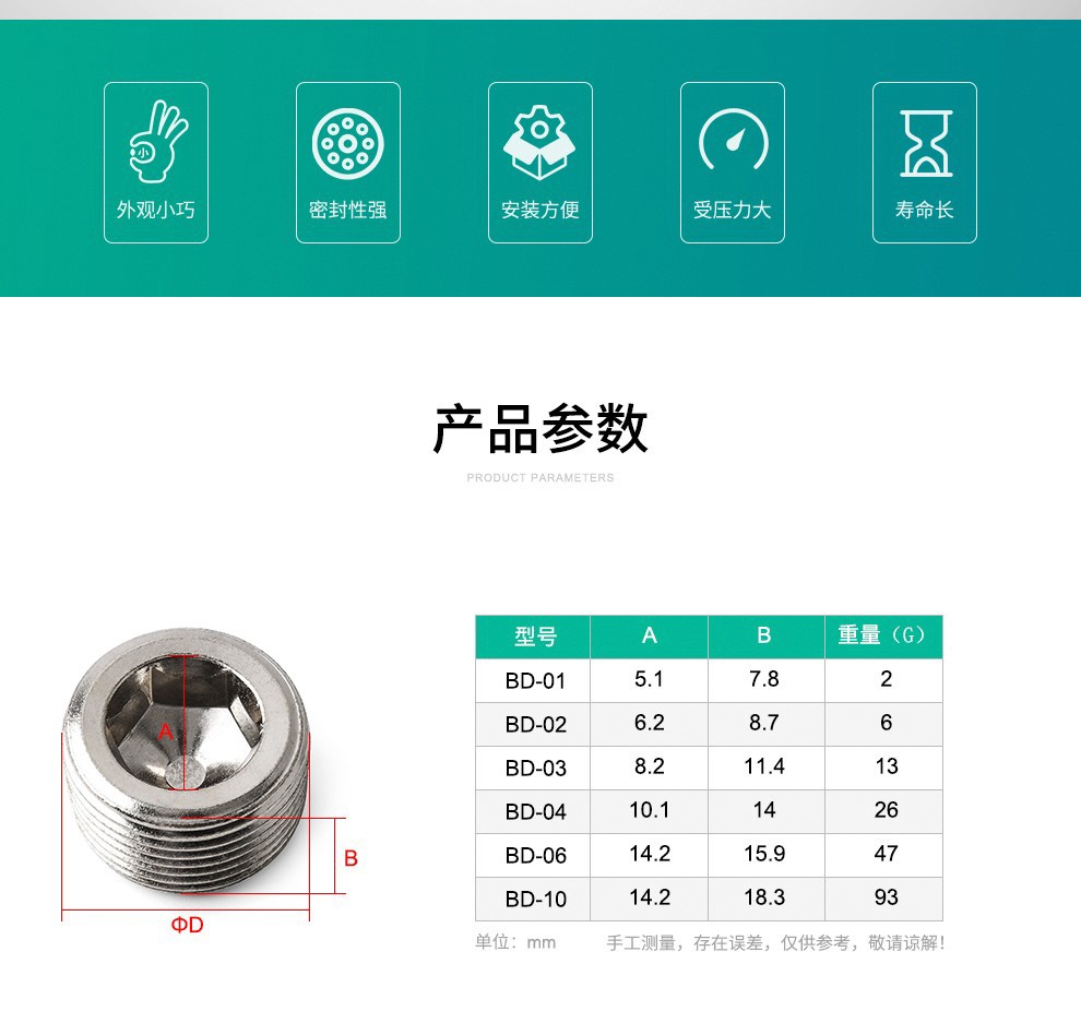 > 伊莱科(ELECALL)气管接头气管堵头内六角气动丝堵气动元件 BD-06 6分(3/4) 5只装