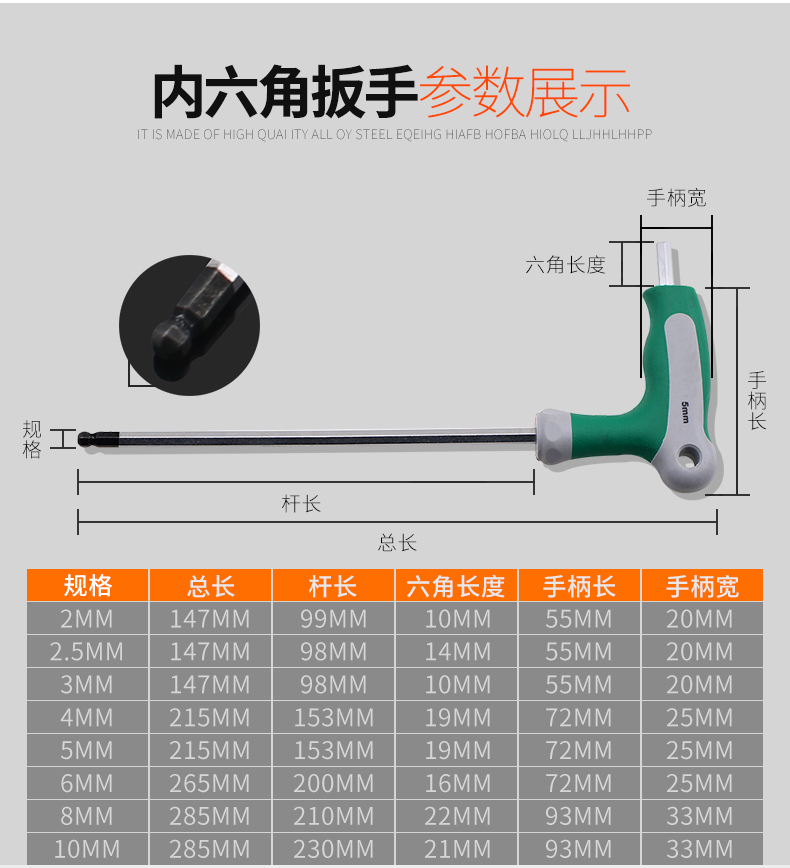 佰瑞特 带柄T型内六角扳手单个7型螺丝刀球圆头六棱角扳手六角匙铬钒钢 4.0 mm