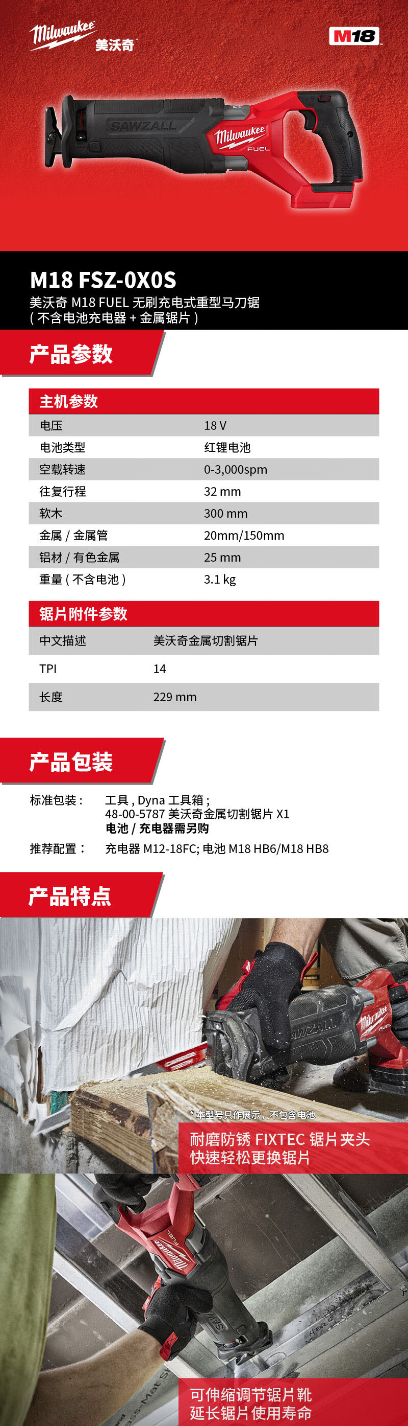 > 美沃奇 M18 FSZ-0X0S M18 FUEL无刷充电式重型马刀锯(不含电池充电器+金属锯片)