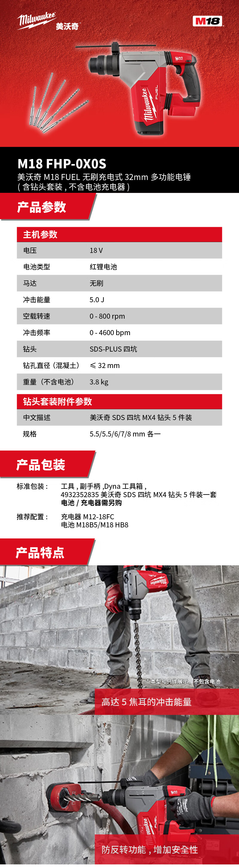 > 美沃奇 M18 FHP-0XS M18 FUEL无刷充电式32mm多功能电锤(不含电池充电器+钻头套装)