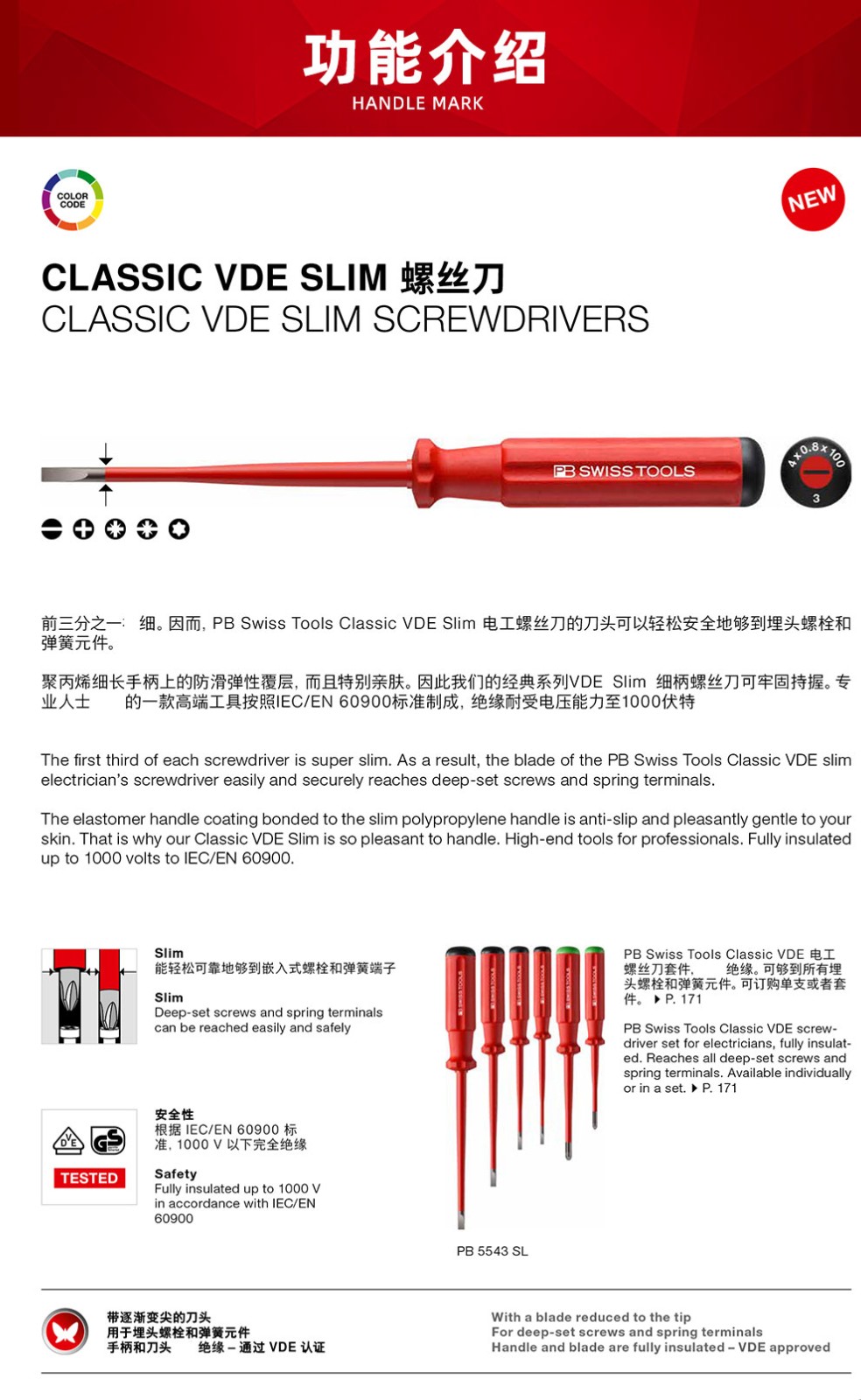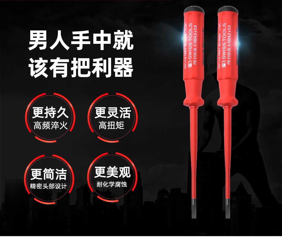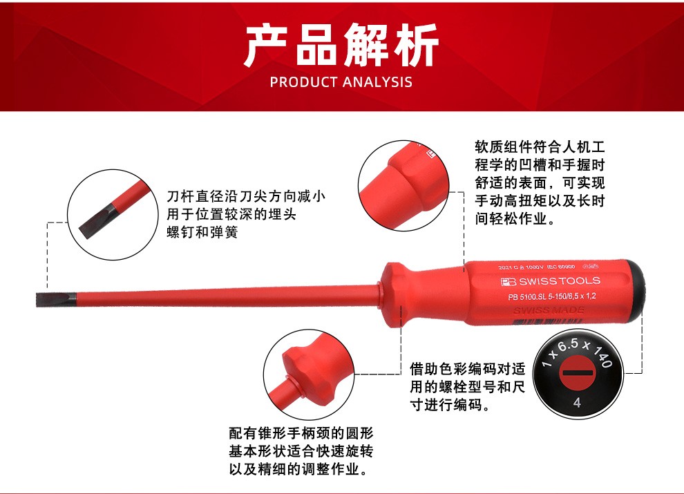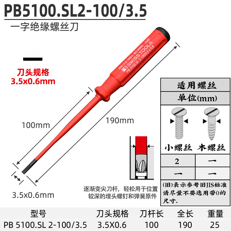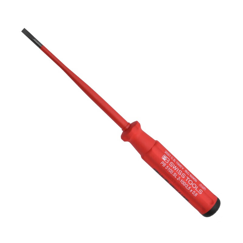 > PB SWISSTOOLS进口十字一字绝缘螺丝刀耐高压1000V电工专业细杆螺丝批起子套装 一字3.5*100mm