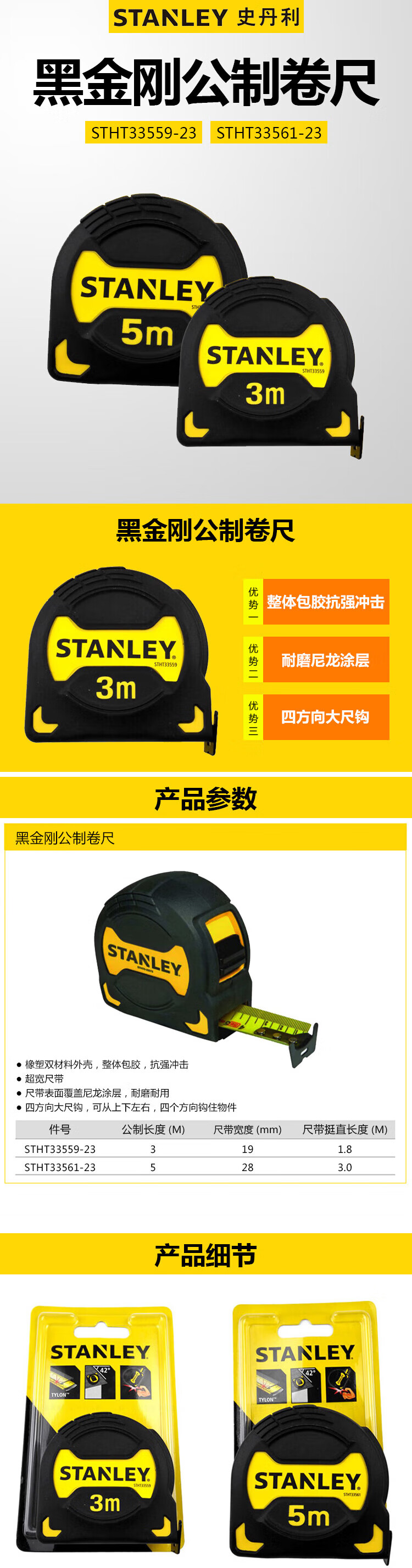 史丹利(STANLEY)黑金刚公制卷尺5mx28mm高精度耐磨测量盒尺伸缩木工尺STHT33561
