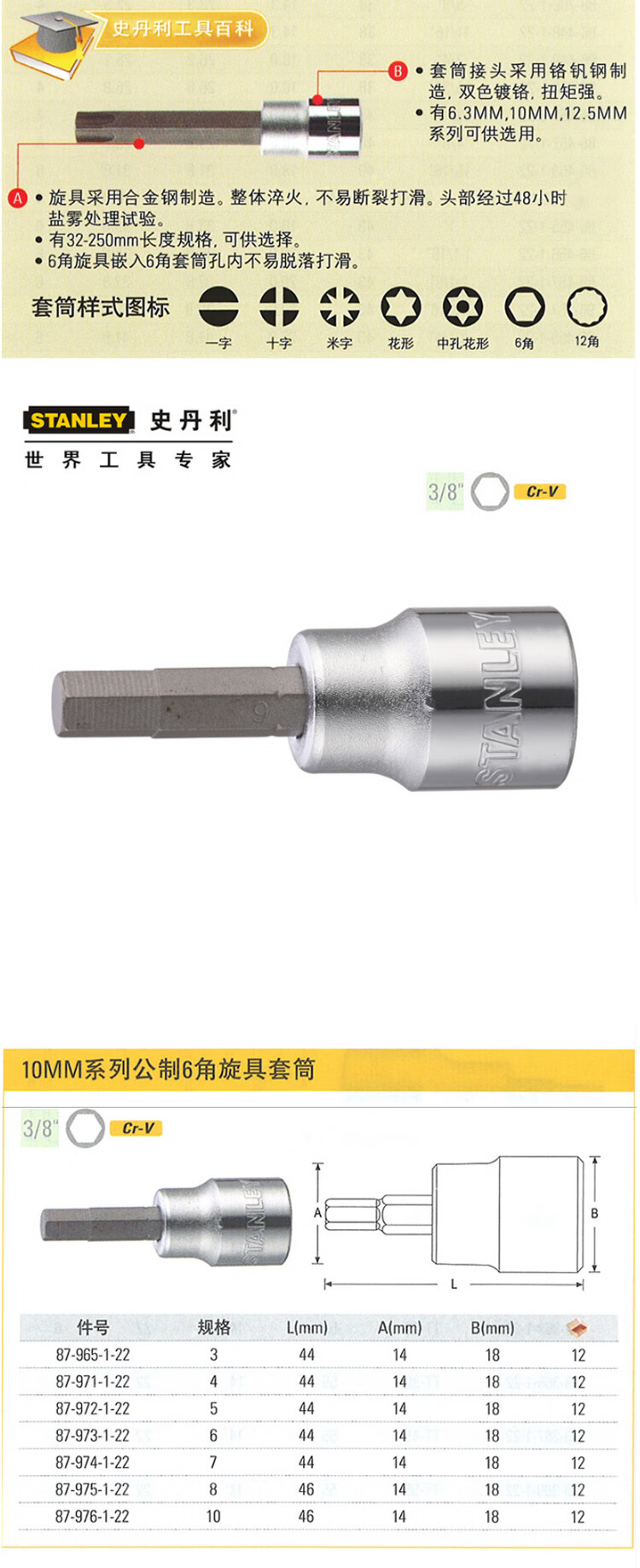 > 史丹利(STANLEY)10MM系列6角旋具套筒3/8中飞棘轮扳手用套筒批头5mm87-972