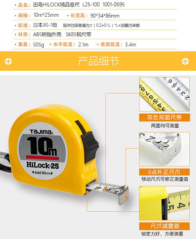 > 田岛(TaJIma)长10米钢卷尺公制尺带双面刻度25mm宽L25100 1001-0695