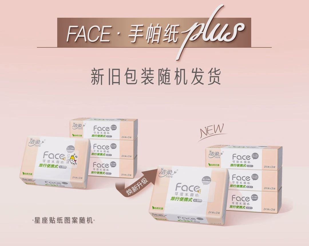 洁柔粉Face手帕纸3层可湿水面巾抽纸旅行便携经济装整 1层 1片*1包 203*200mm3层24抽10包*2提