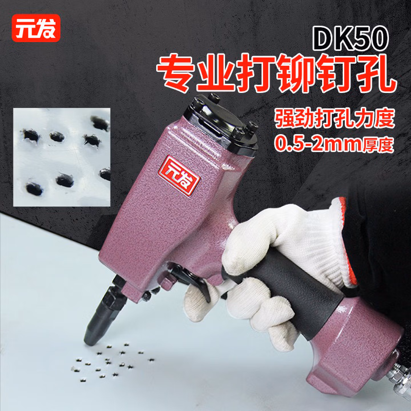 元发铆钉孔枪气动孔器 彩钢板铁皮广告字牌冲孔洞 元发气动打孔枪DK50_(纸盒包装