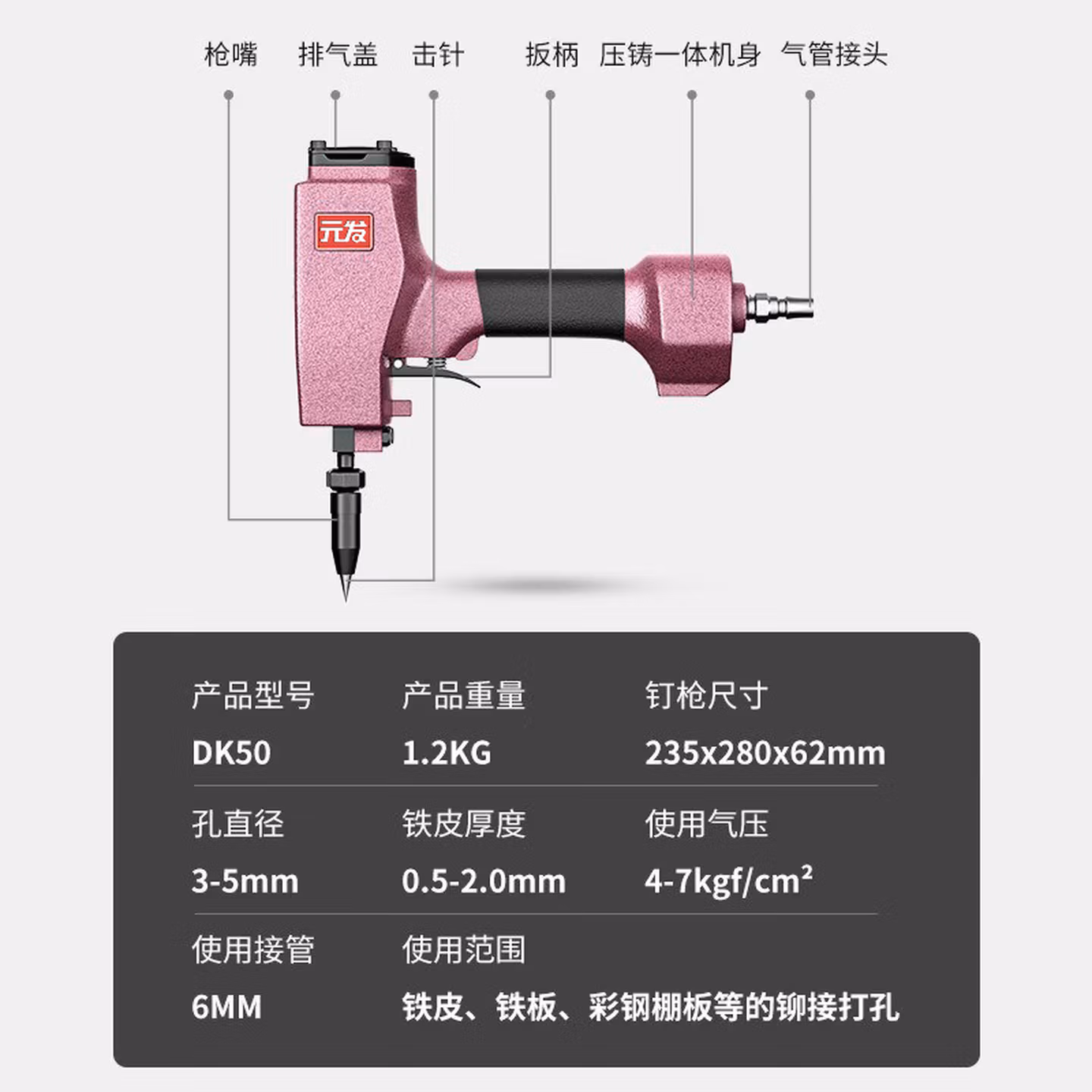 > 元发铆钉孔枪气动孔器 彩钢板铁皮广告字牌冲孔洞 元发气动打孔枪DK50_(纸盒包装