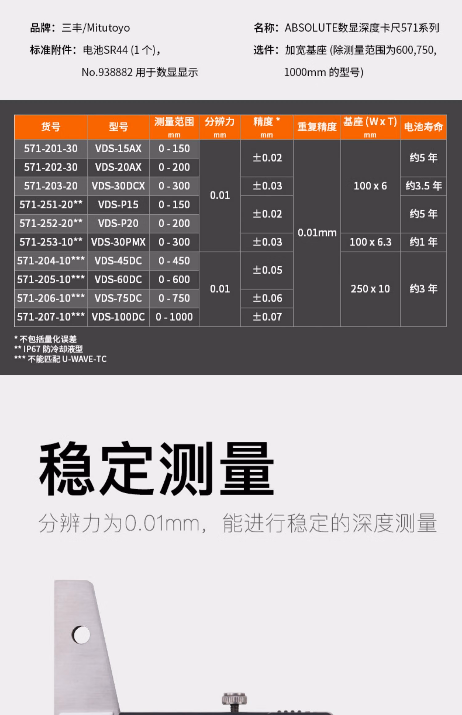 三丰(Mitutoyo)数显深度游标卡尺 C电子深度尺 日本原装进口 571-251-20/0-150mm/0.01/IP67