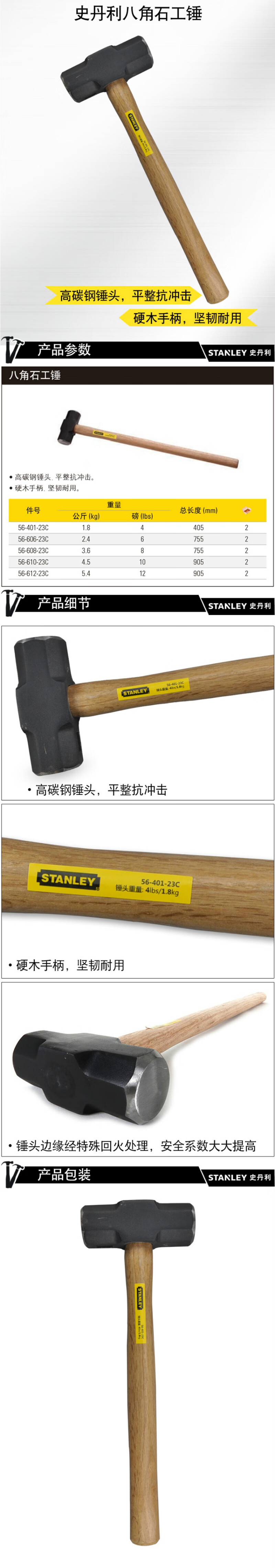 史丹利(STANLEY)木柄八角石工锤4lbs榔头大铁锤安装锤56-401-23C