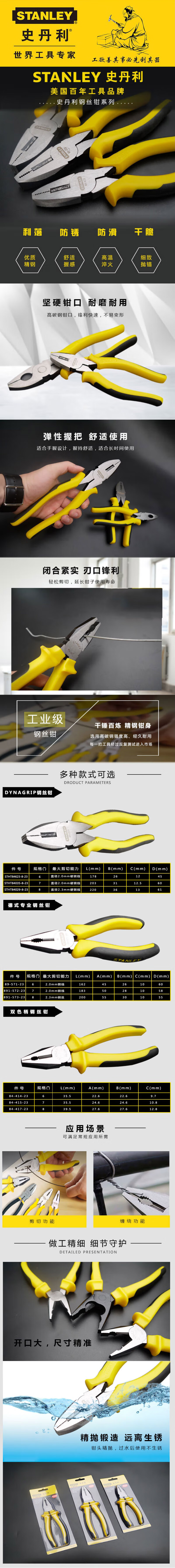 > 史丹利(STANLEY)DYNAGRIP钢丝钳6“ 多功能老虎钳电工钳断线钳 STHT84623