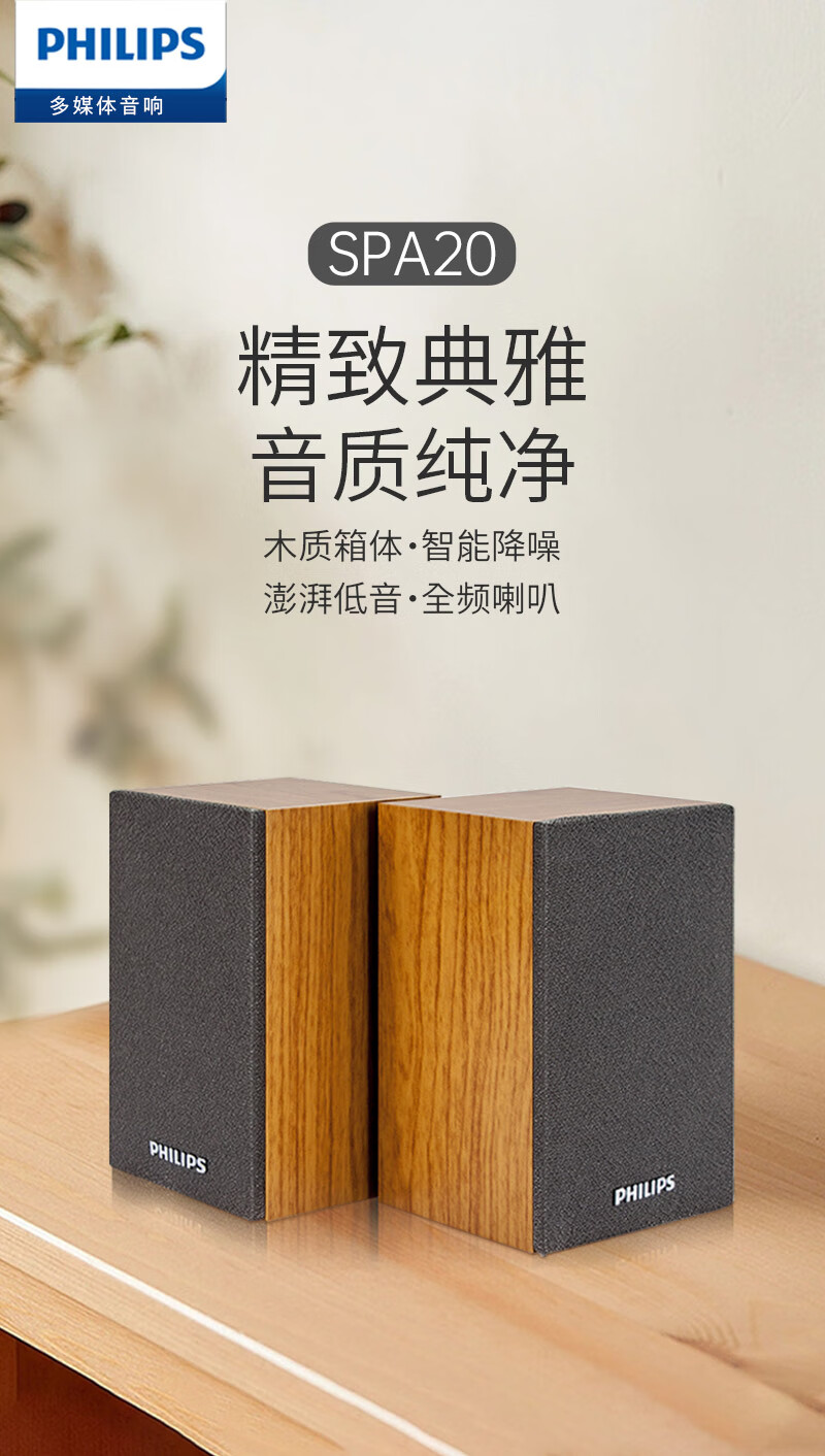 > 飞利浦(PHILIPS)SPA20蓝牙音箱电脑音响桌面木质小音箱台式usb笔记本音响多媒体重低音家用游戏扩音器