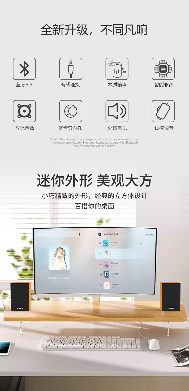 飞利浦(PHILIPS)SPA20蓝牙音箱电脑音响桌面木质小音箱台式usb笔记本音响多媒体重低音家用游戏扩音器