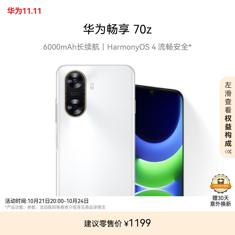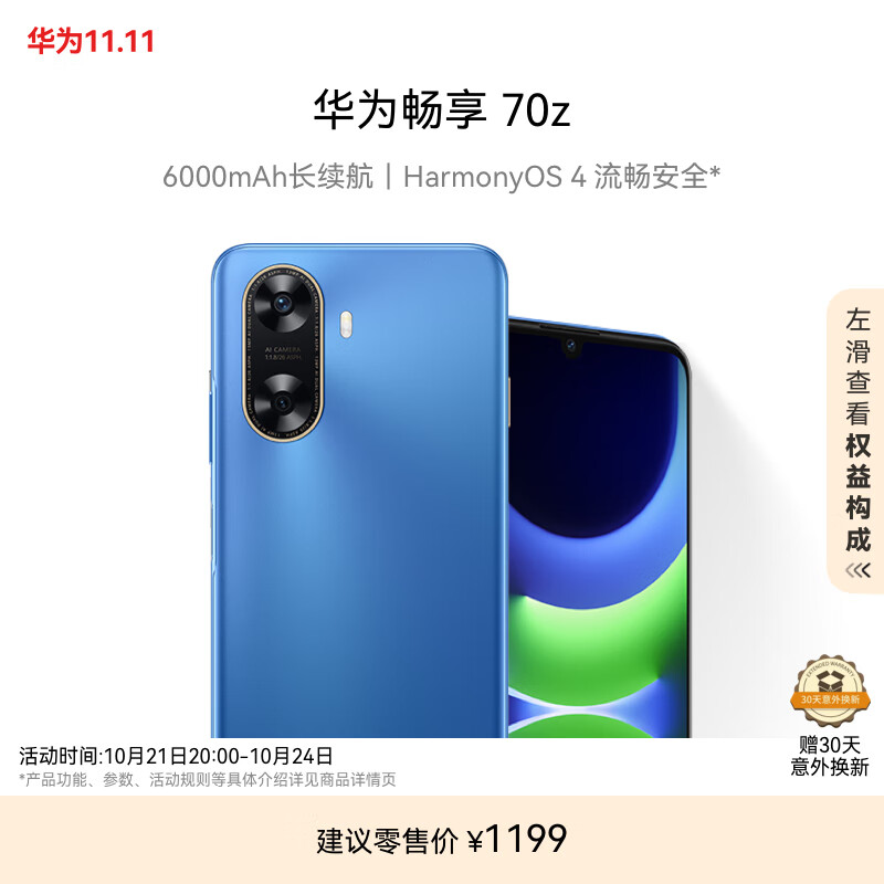 > 华为畅享 70z 6000mAh 长续航 HarmonyOS 4 流畅安全 幻夜黑 128GB 鸿蒙智能手机HUAWEI