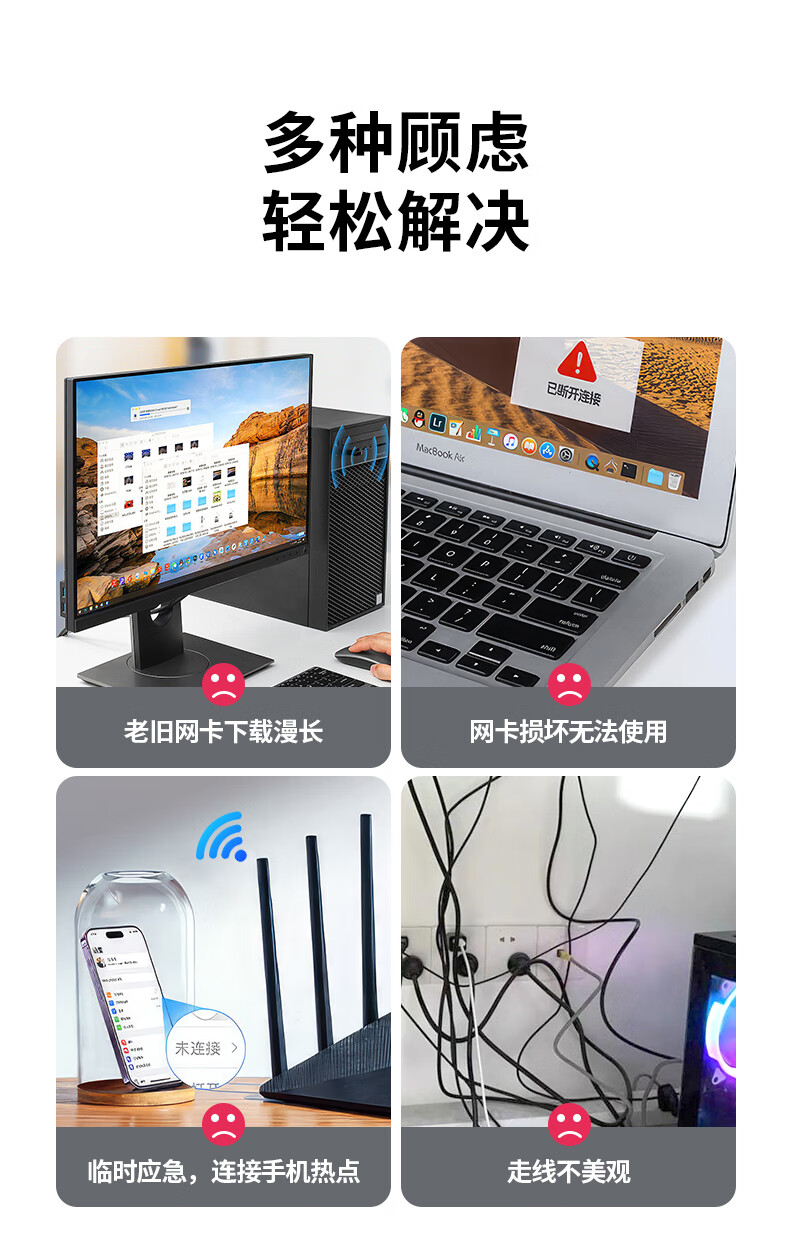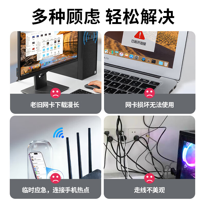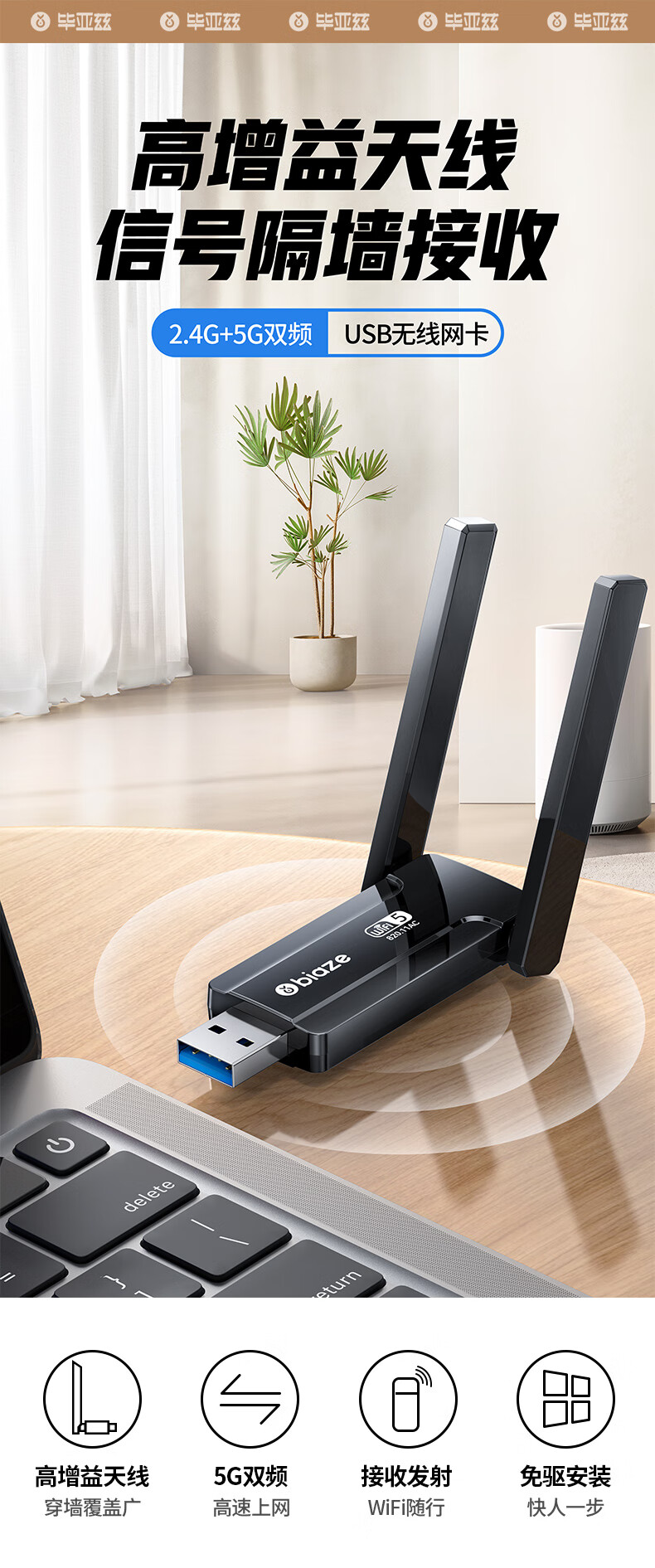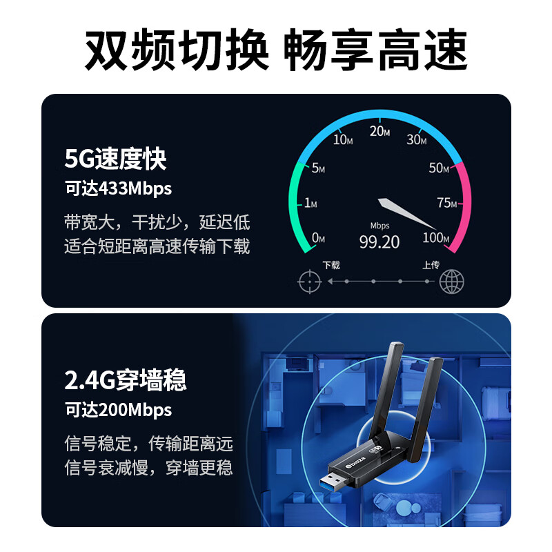 > 毕亚兹 USB无线网卡免驱版 AC650M双频5G网卡 台式机笔记本电脑无线接收器随身WiFi发射接收器 外置天线