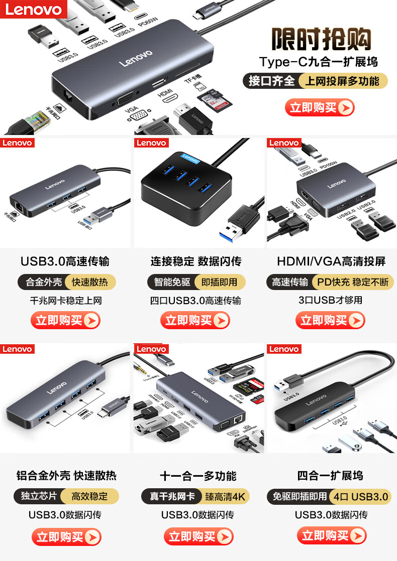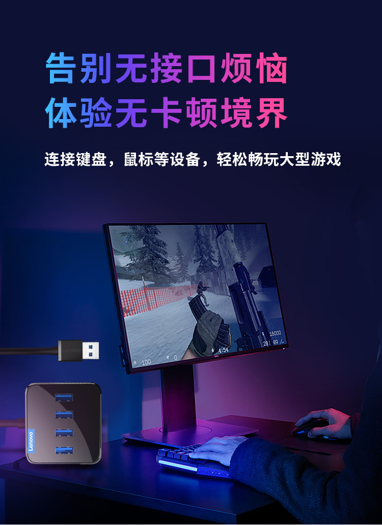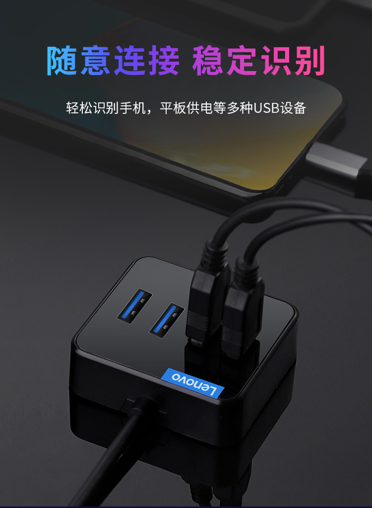> 联想USB分线器3.0接口转换器四合一扩展坞转接头HUB集线器USB延长线一拖多笔记本/台式机转换器1.5m