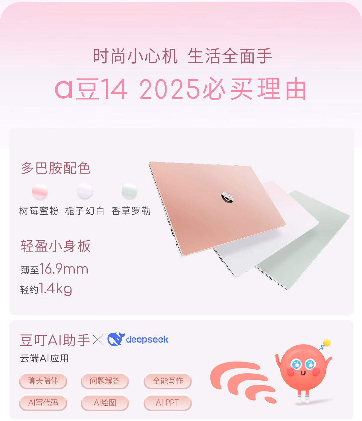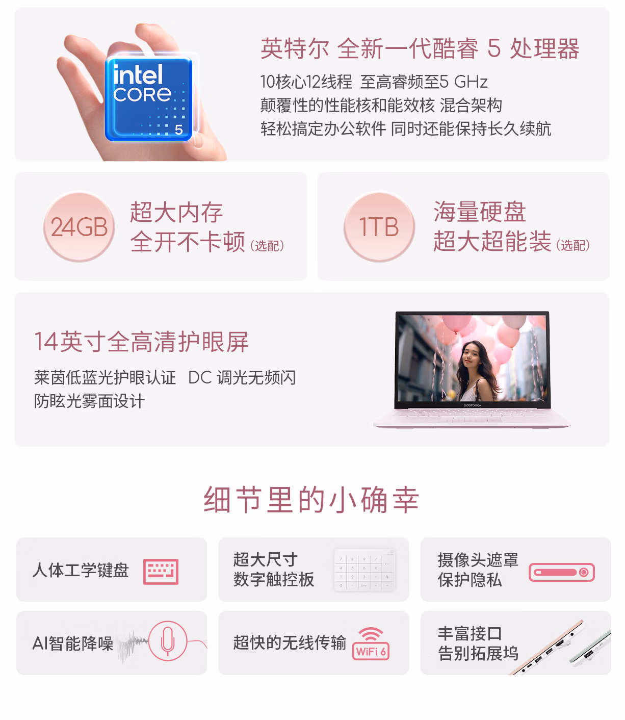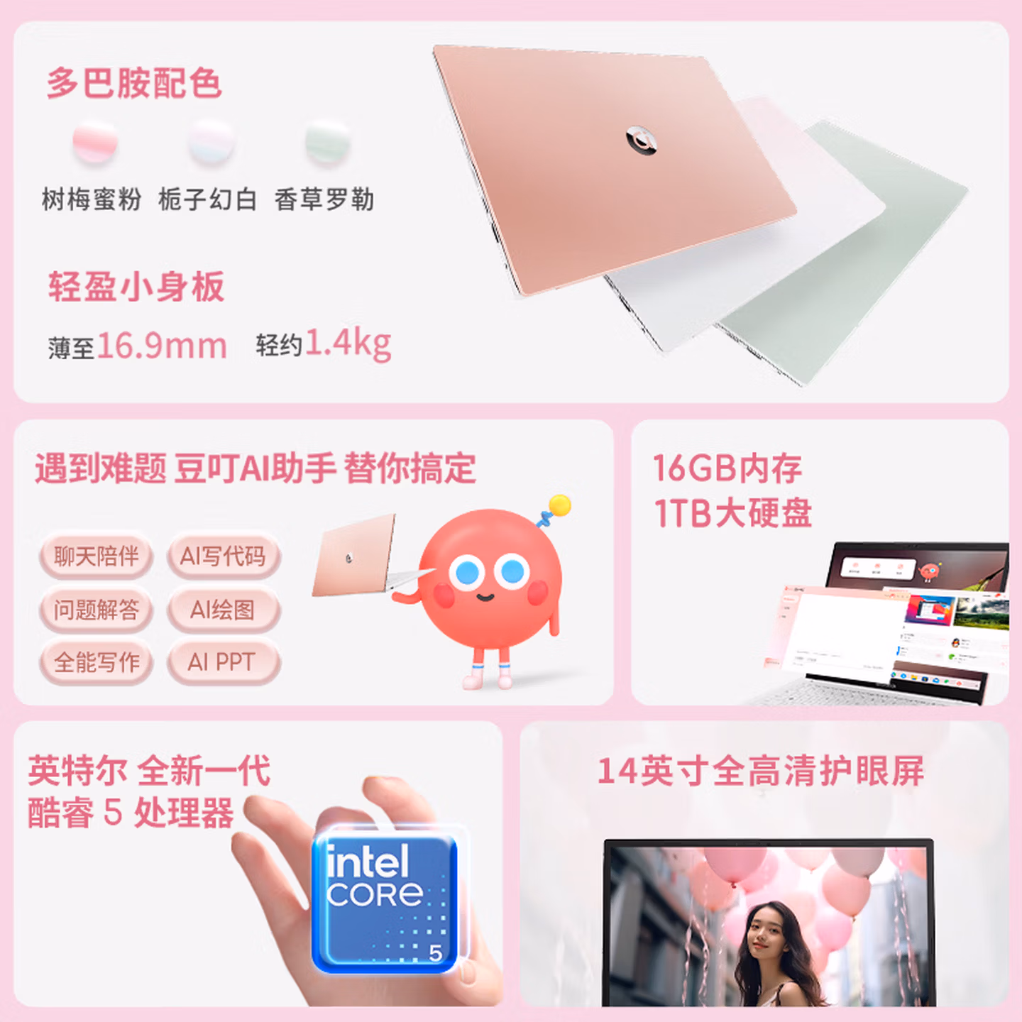 > 华硕a豆14 高颜值AI轻薄本 笔记本电脑(全新酷睿5 16G 1T大硬盘 护眼屏 预装office)
