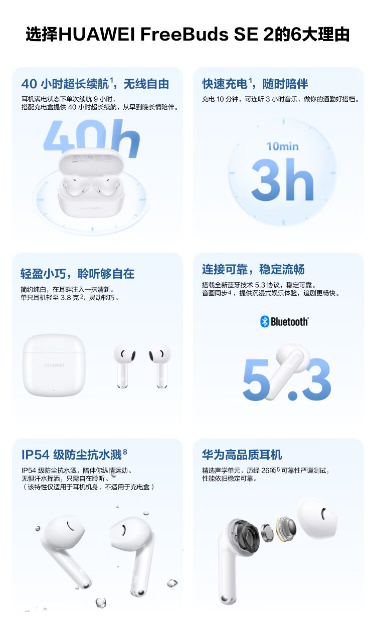 华为长续航蓝牙耳机 FreeBuds SE 2无线耳机 40小时长续航 快速充电 蓝牙5.3适用于苹果/安卓手机 白