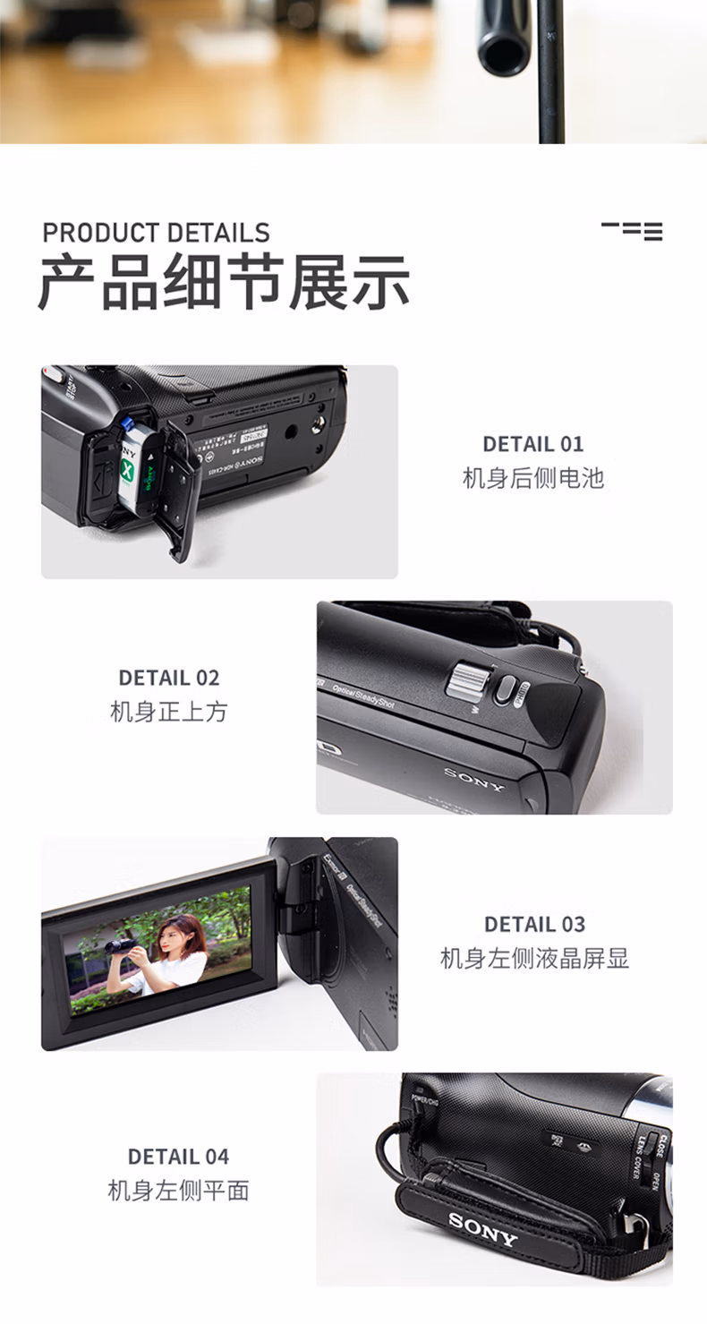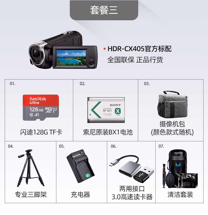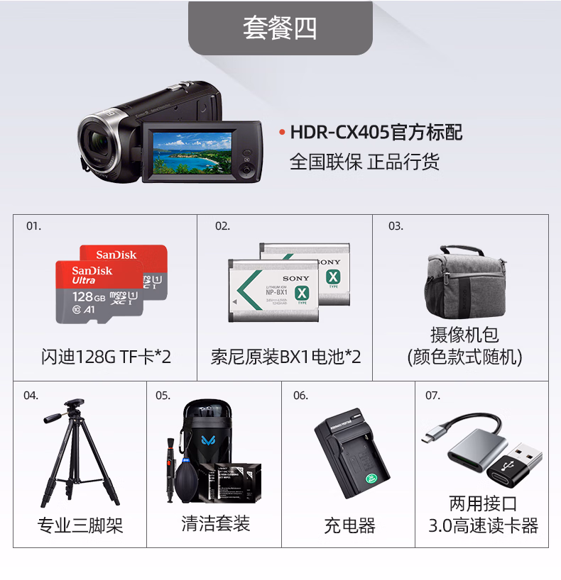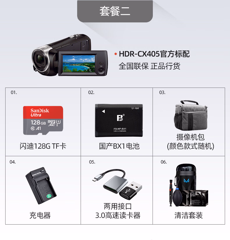 > SONY 索尼 HDR-CX405高清数码摄像机便携式专业直播视频拍摄摄影机家用旅游学生随身录像机 HDR-CX405 套餐二