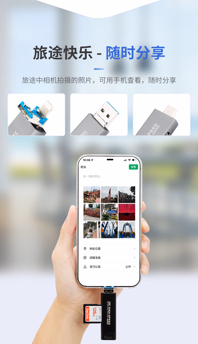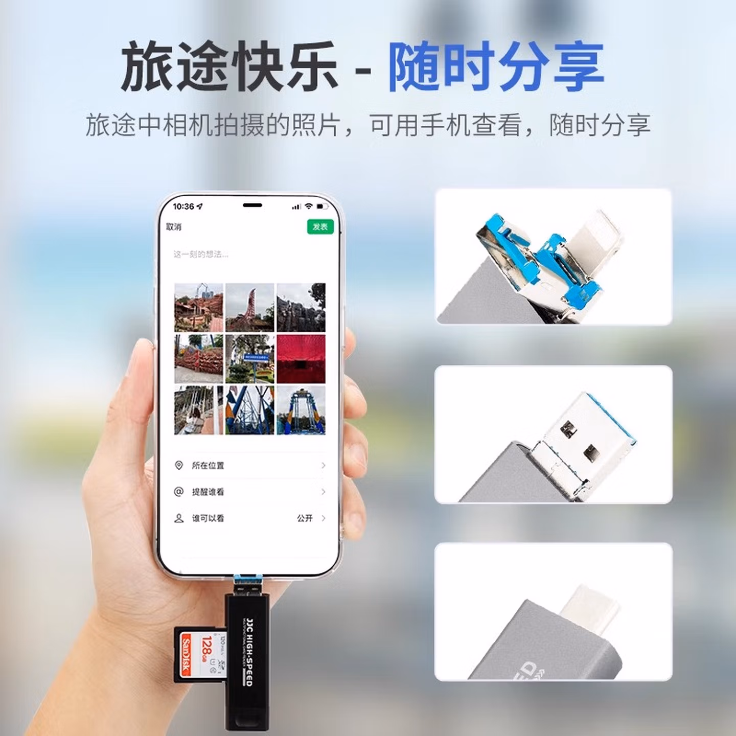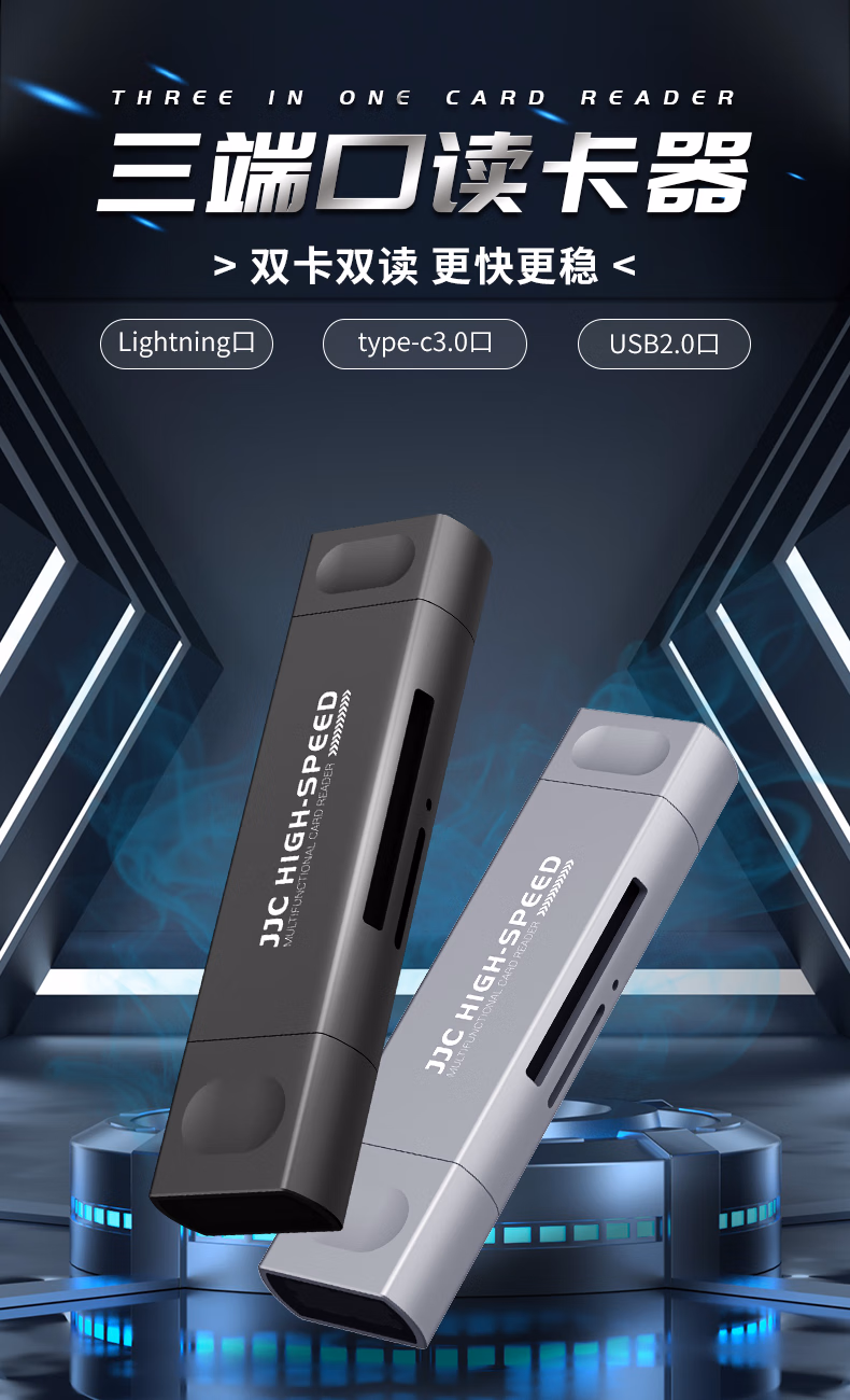 JJC 高速读卡器 适用于苹果手机iPhone16/15/14/13Pro华为SD/TF卡USB相机iPad内存卡转换外接存储读取 商务灰 Lightning+USB+Type-C口