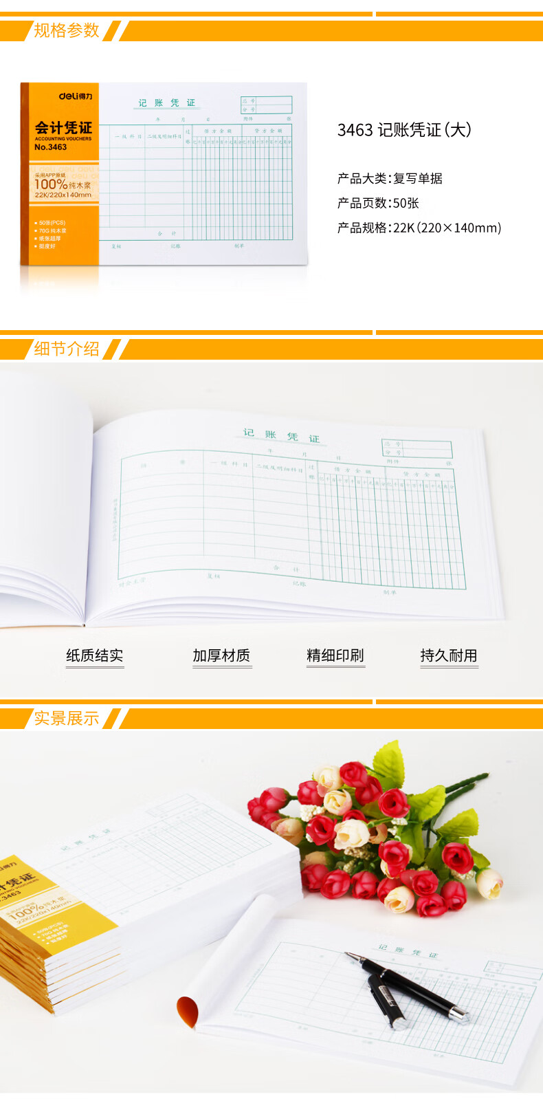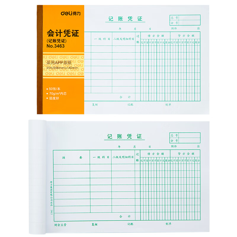 > 得力(deli)十本装22K记账凭证 50张/本220*140mm 记账凭证单据票据 通用空白凭证纸 办公用品 3463